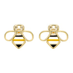 This pair of gold earrings features charming bees, each with sparkling diamond eyes. The bees' bodies are hand-painted in vibrant black and yellow enamel, creating a striking contrast. Playful yet elegant, these earrings add a lively, colorful touch to any ensemble.
