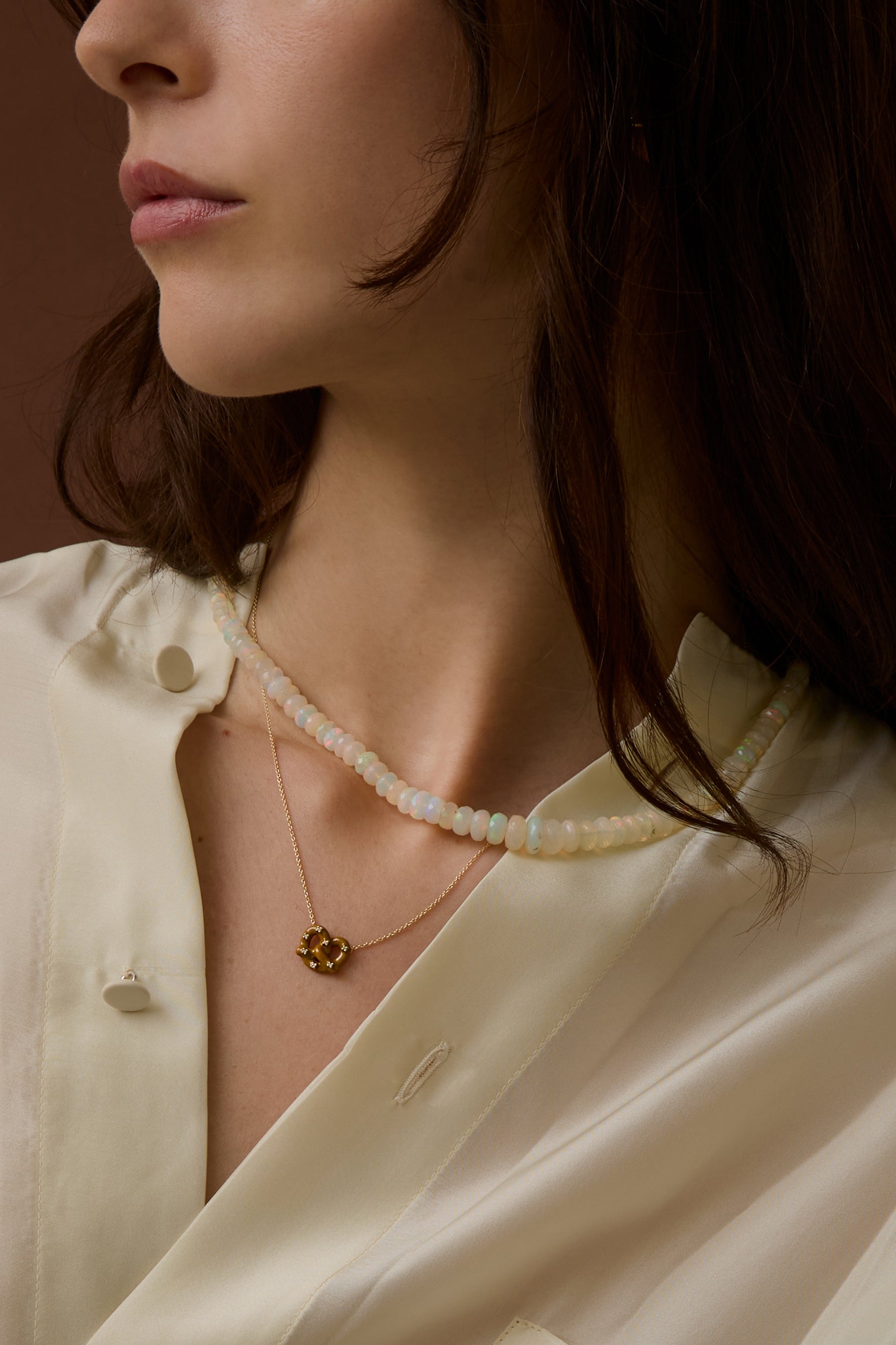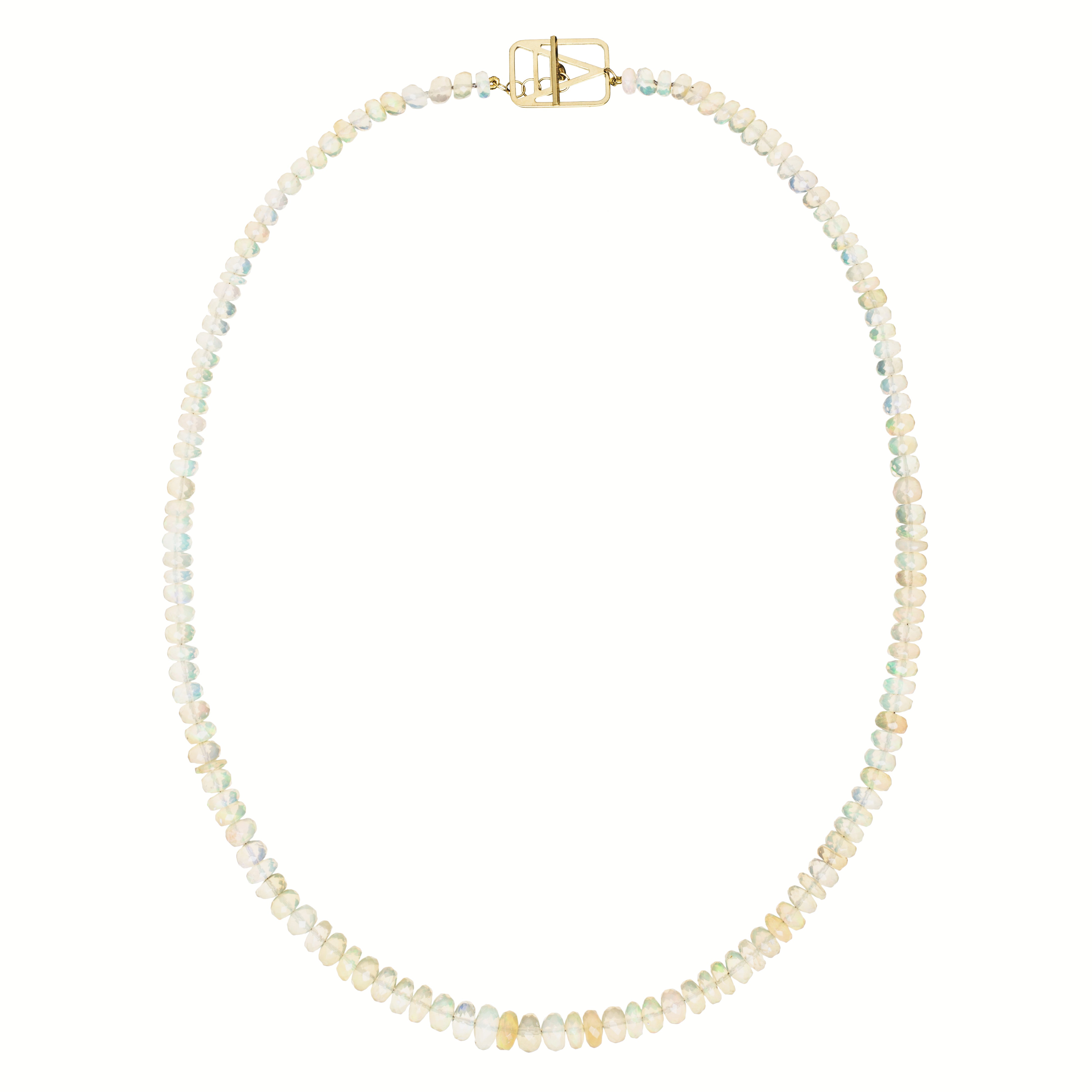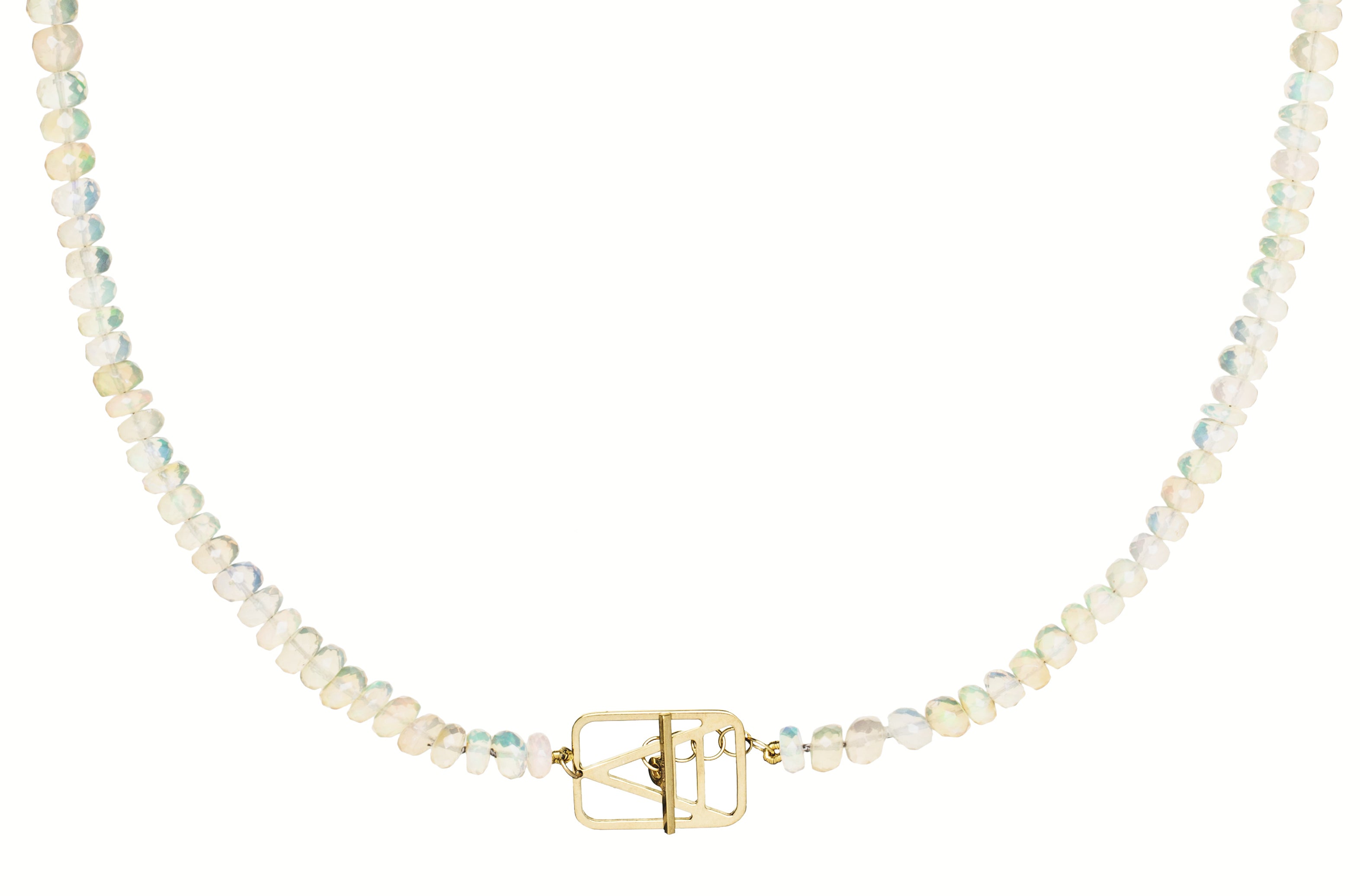 Discover timeless elegance with a modern twist in the A Deco necklace. Inspired by the refined glamour of the Art Deco era, this distinctive necklace features ethereal white opal beads arranged in a delicate dégradé setting—a graceful transition from smaller to larger stones that captures light with every movement.