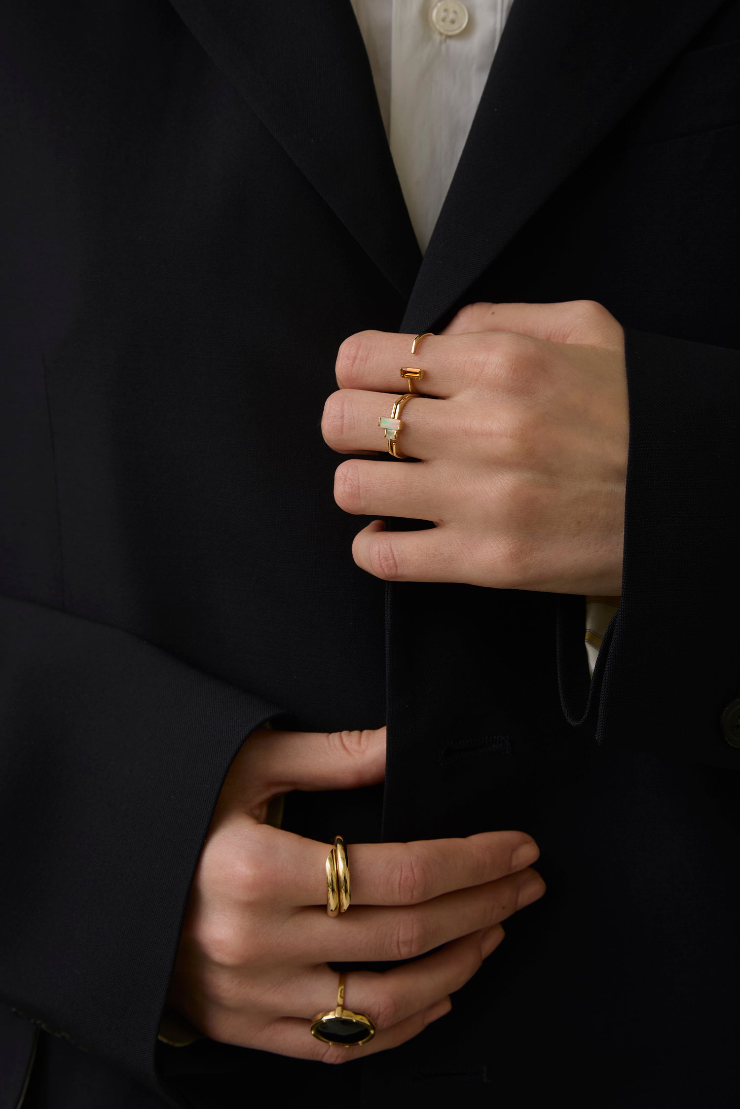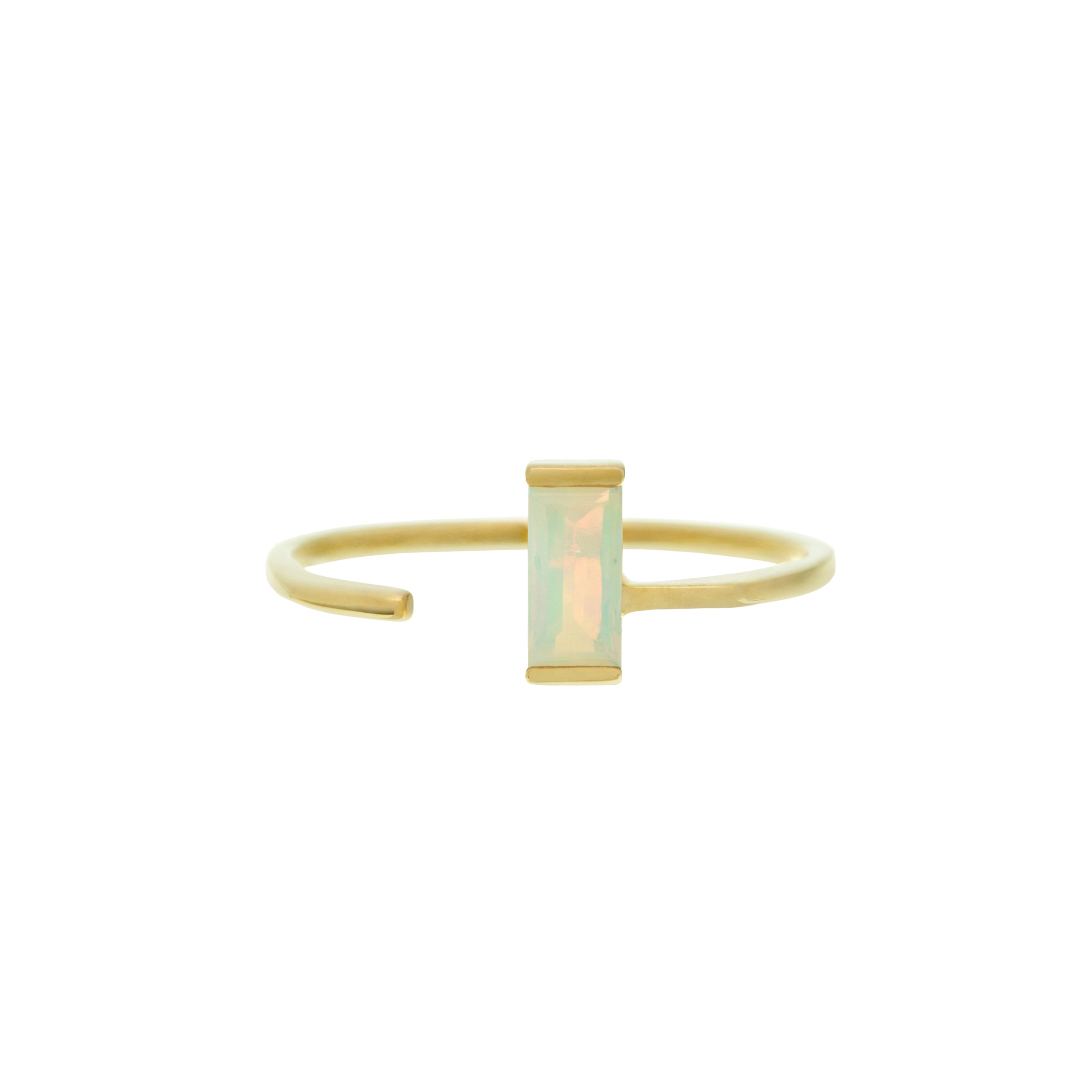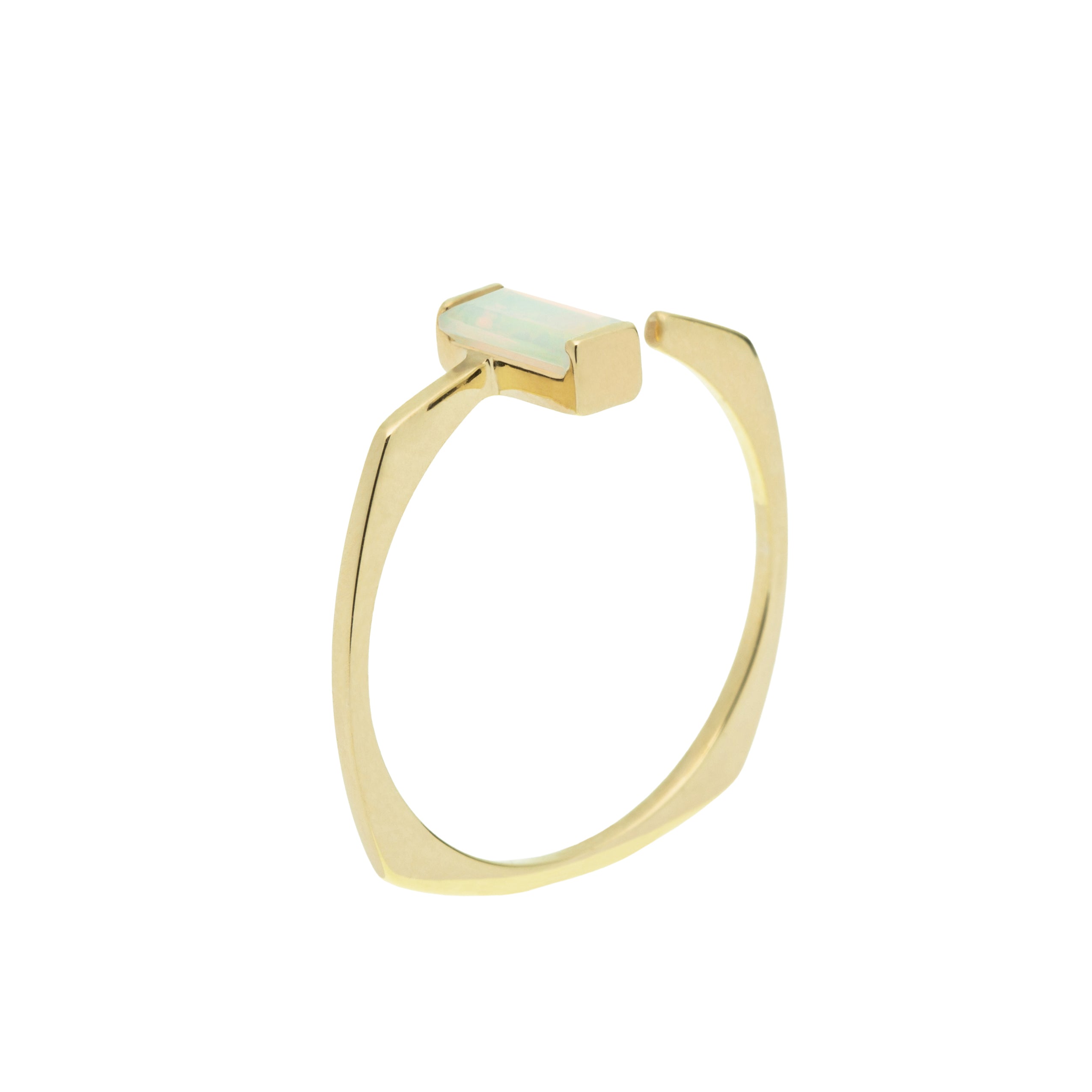 A baguette-cut white opal brings soft iridescence to this clean, minimal ring. Its open front and gentle lines allow the stone to stand out without excess. Pair with a carré-cut ring for a delicate contrast in shape and texture.