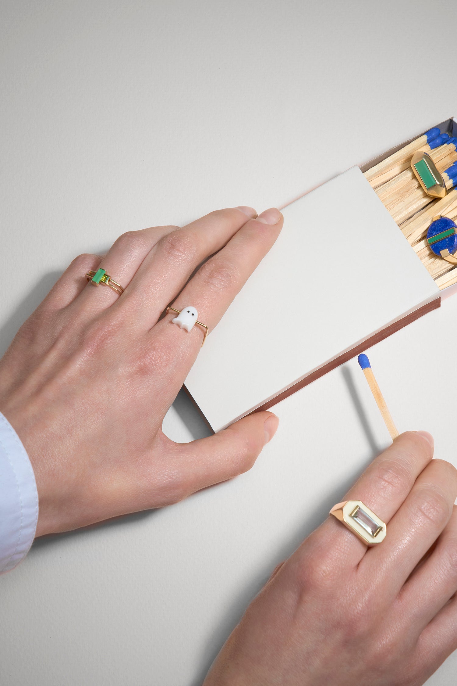 A minimal ring with a soft rounded-square shape, gently open at the front and set with a baguette-cut chrysoprase. The delicate green hue adds a fresh, understated touch. Designed to interlock effortlessly with carré-cut styles for subtle, personal combinations.