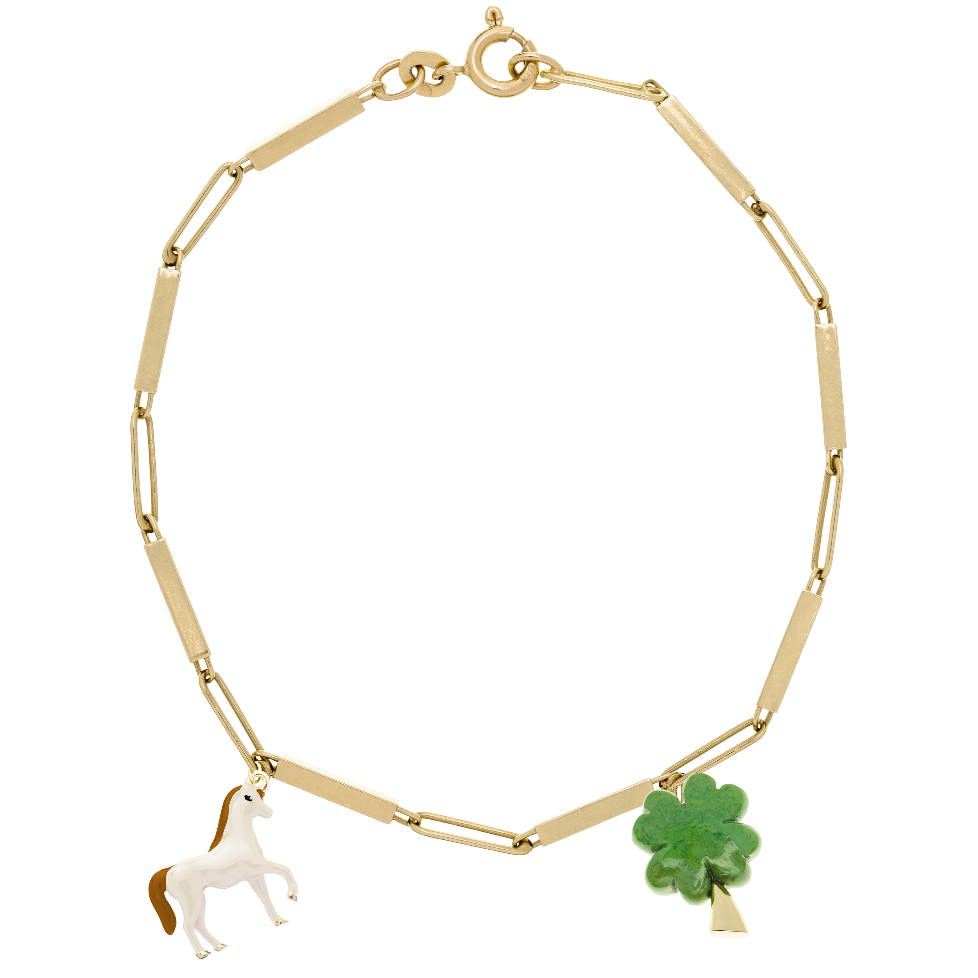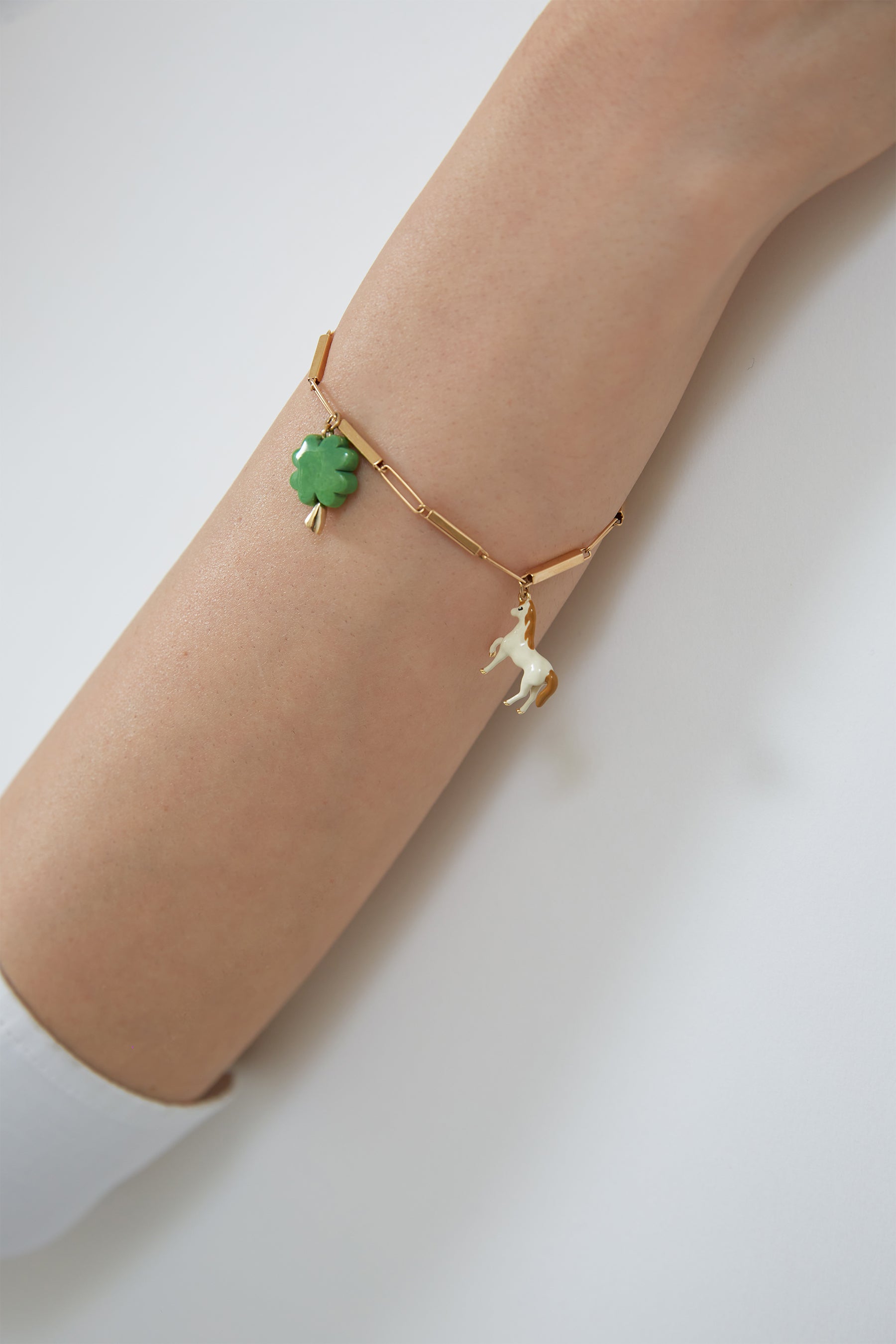 Discover timeless elegance with our 9kt yellow gold Deco tubitos bracelet, featuring an innovative Art Deco-inspired chain. Adorned with a hand-painted white enamel Caballo (horse) pendant and the Clover made of green turquoise, this piece blends strength, beauty, and luck. A true statement of modern craftsmanship and sophistication.