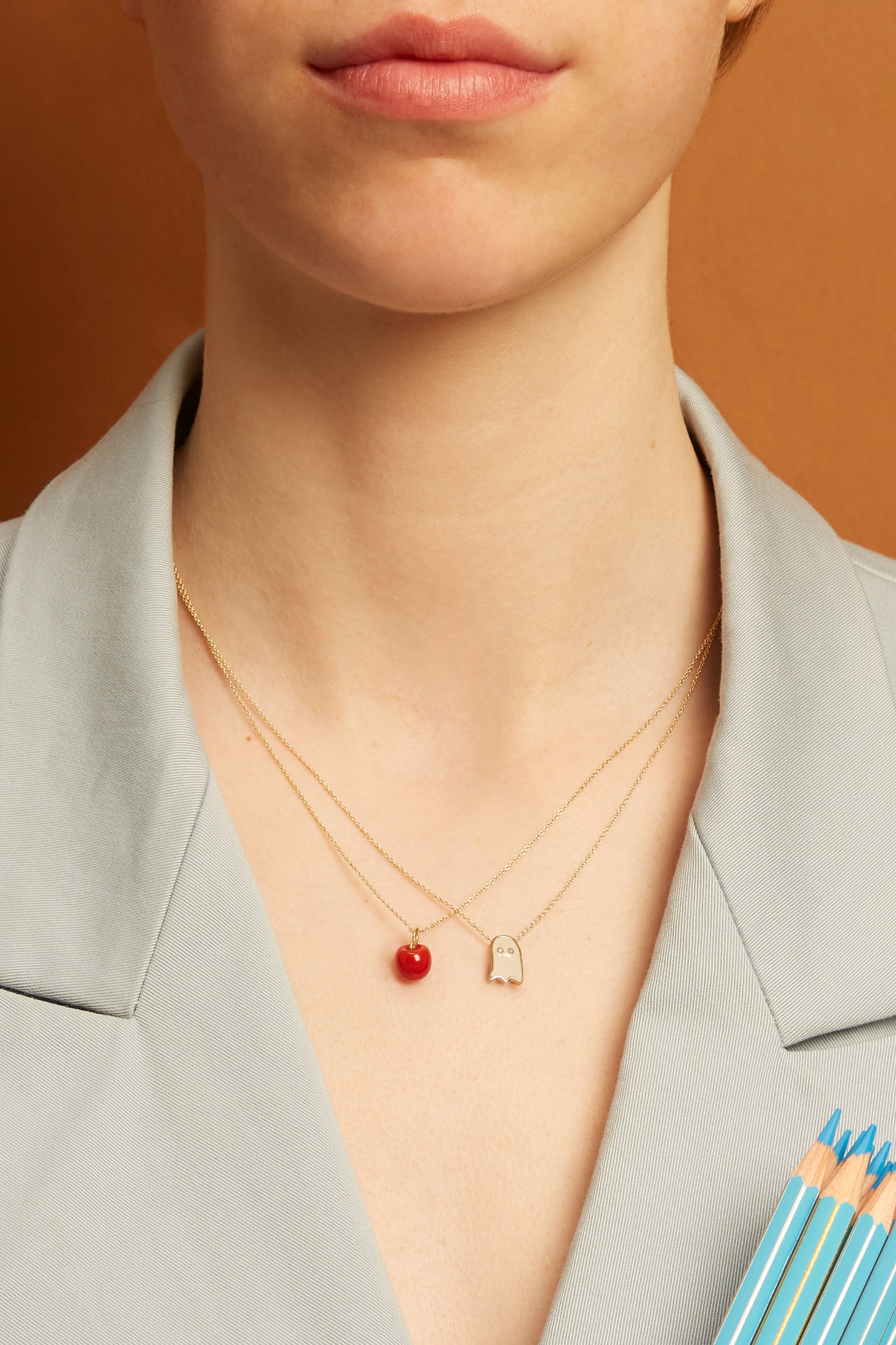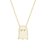 Channel your inner spirit with our enchanting gold ghost necklace. Fantasma Brillante ghost is meticulously crafted with a glossy white enamel coating and adorned with two dazzling diamonds for eyes. Suspended from a delicate gold chain, this necklace is a must-have for any jewelry collection.