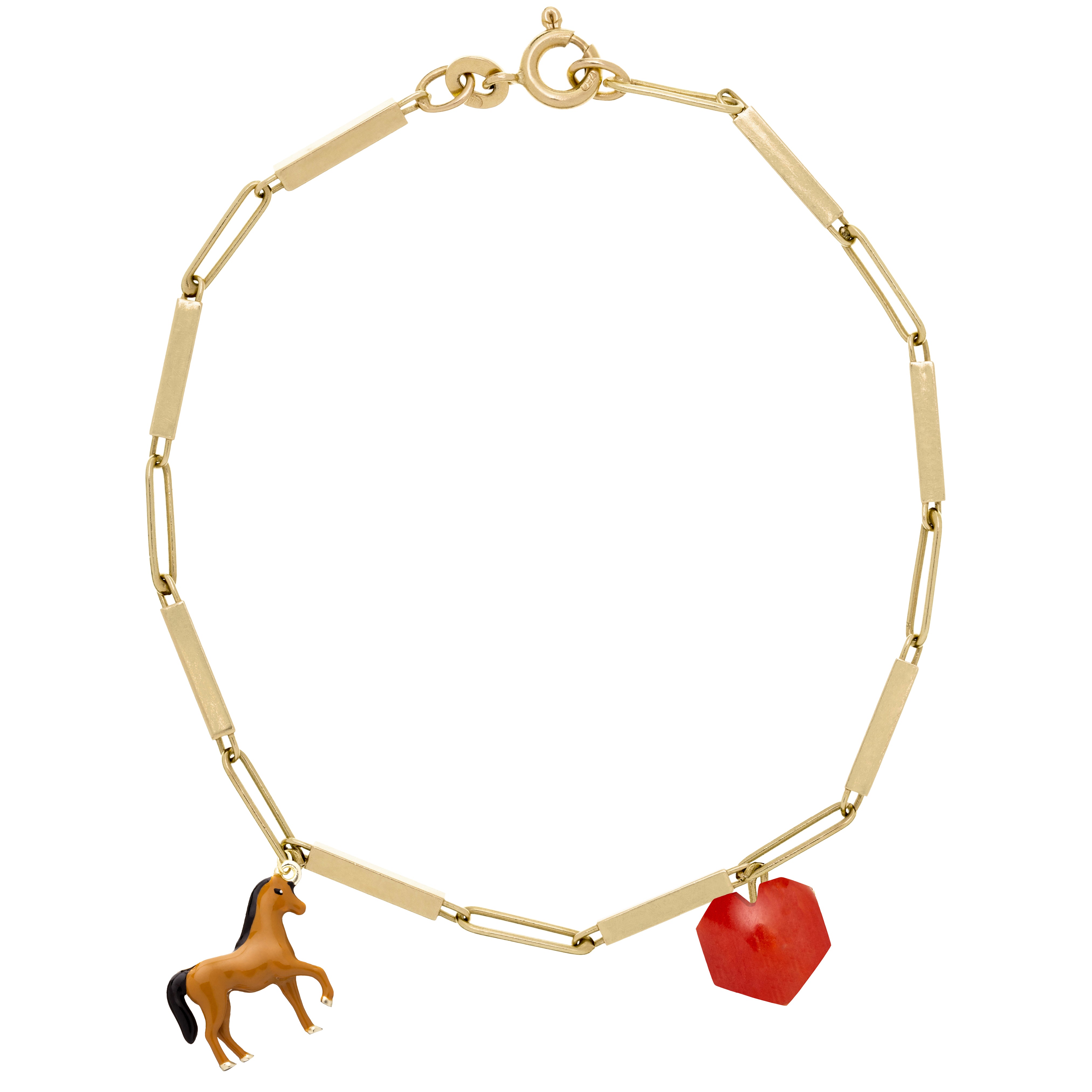 This Deco Tubitos bracelet holds two elegant charms, a finely crafted horse and a vivid red coral heart, a duo that symbolizes strength and passion in perfect harmony. Delicate yet full of character, this bracelet adds a touch of color and meaning to any look. Wear this Deco Tubitos bracelet as a reminder to follow your heart with confidence and a free spirit.