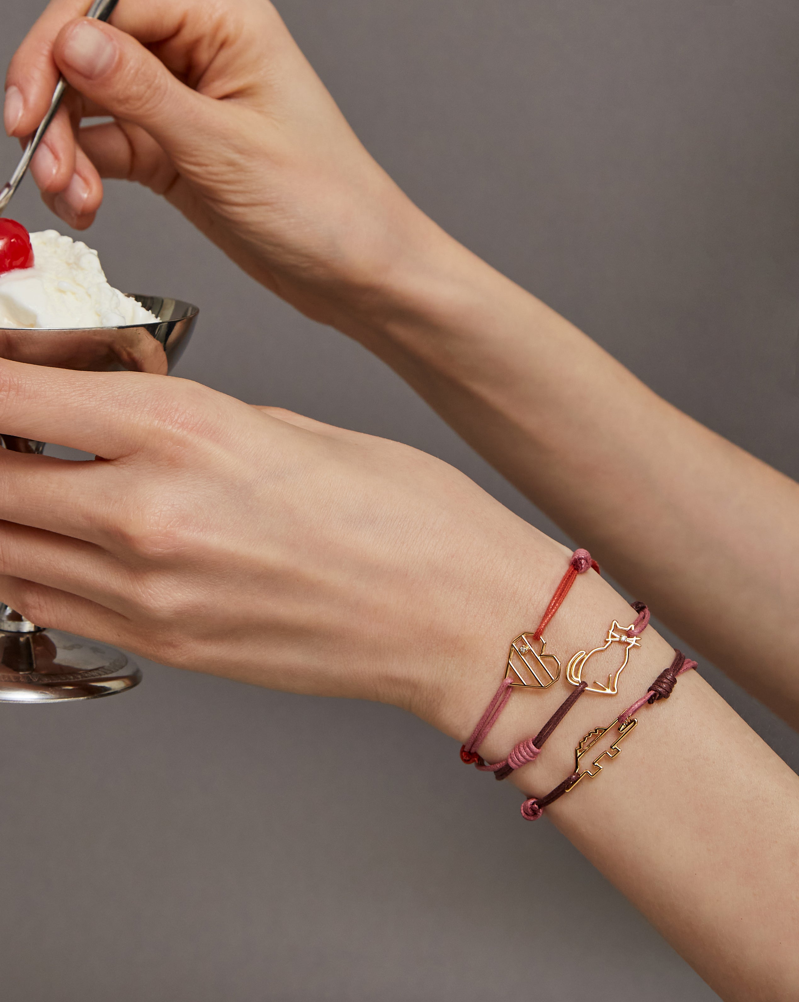 Miau Brillante is our cord bracelet with a "seated" cat shaped pendant with a diamond on his little nose. It's the symbol of tenderness, it's impossibile to resist! We suggest you wear it with Corazón and Casita Zafiro Azul, our heart and little house with blue zapphire will make you always feel at ease.