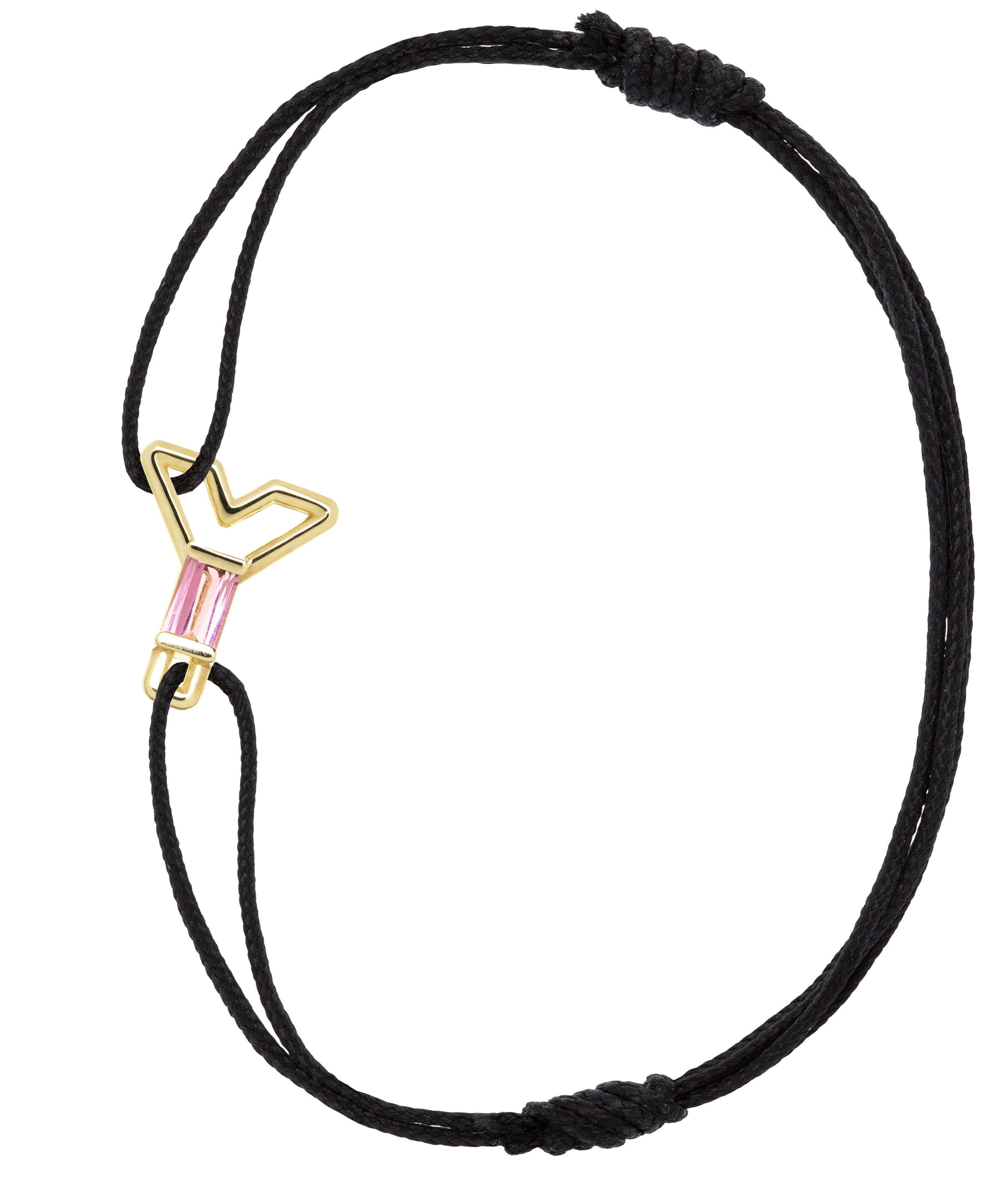 Material: 9kt yellow gold, Pink tourmaline in baguette cut, Cord Eco 100% recycled polyester (0,8 mm)