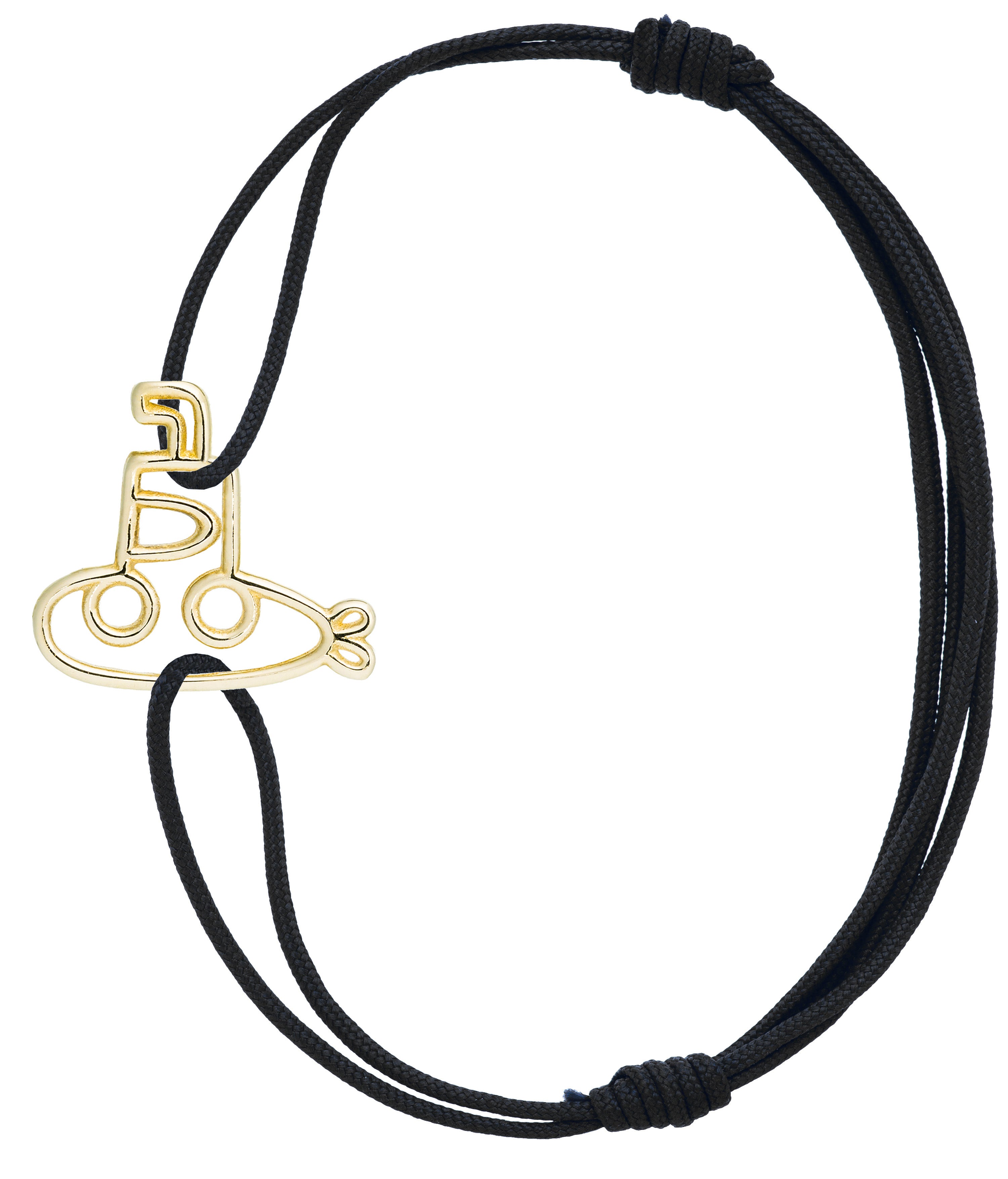A journey on your wrist. The Submarino bracelet pairs a playful cord with a sleek, submarine-shaped charm — a gold symbol of curiosity, crafted for everyday wear.