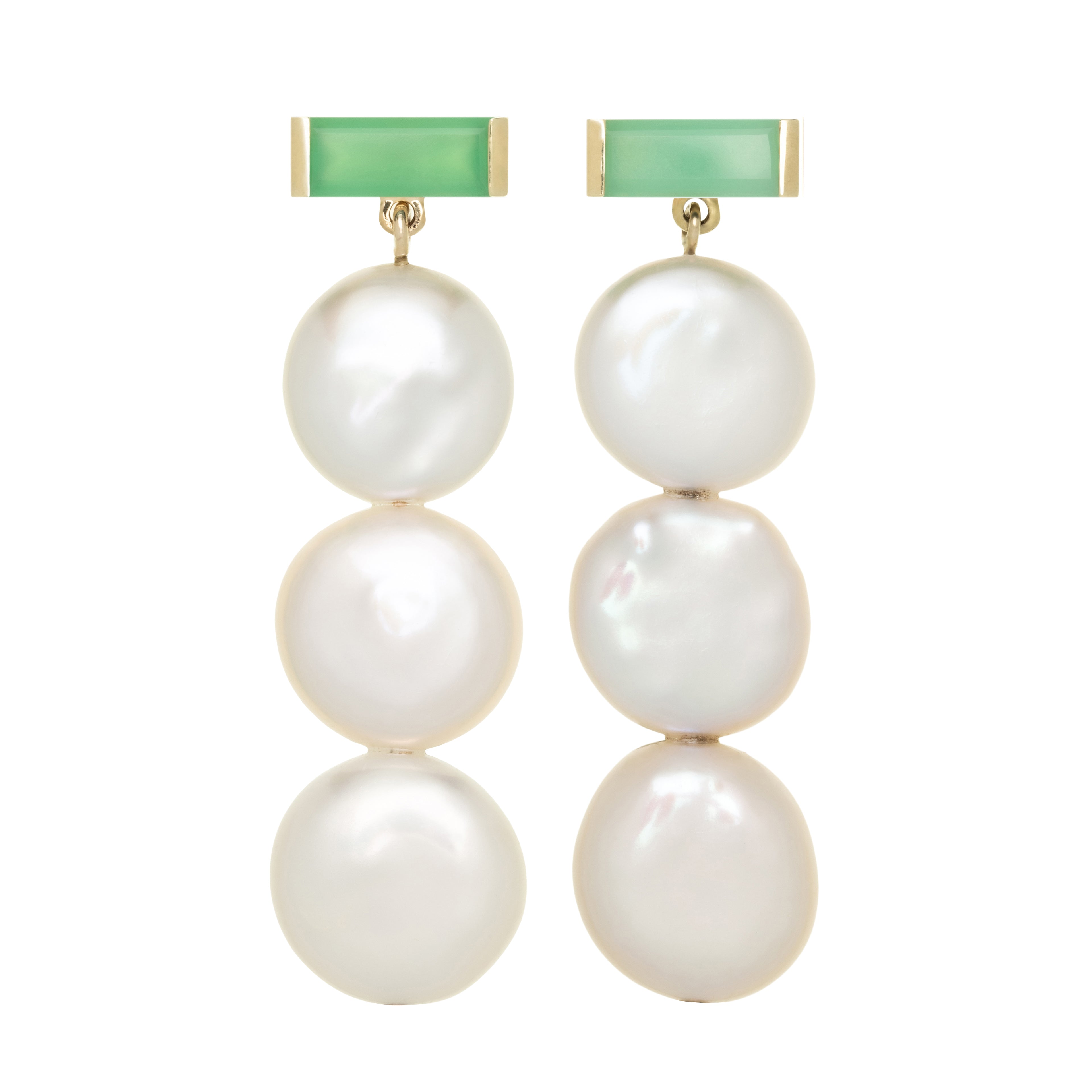 Material: 9kt yellow gold, 18kt yellow gold post backs, Chrysoprase stones in baguette cut, Freshwater coin white pearls
