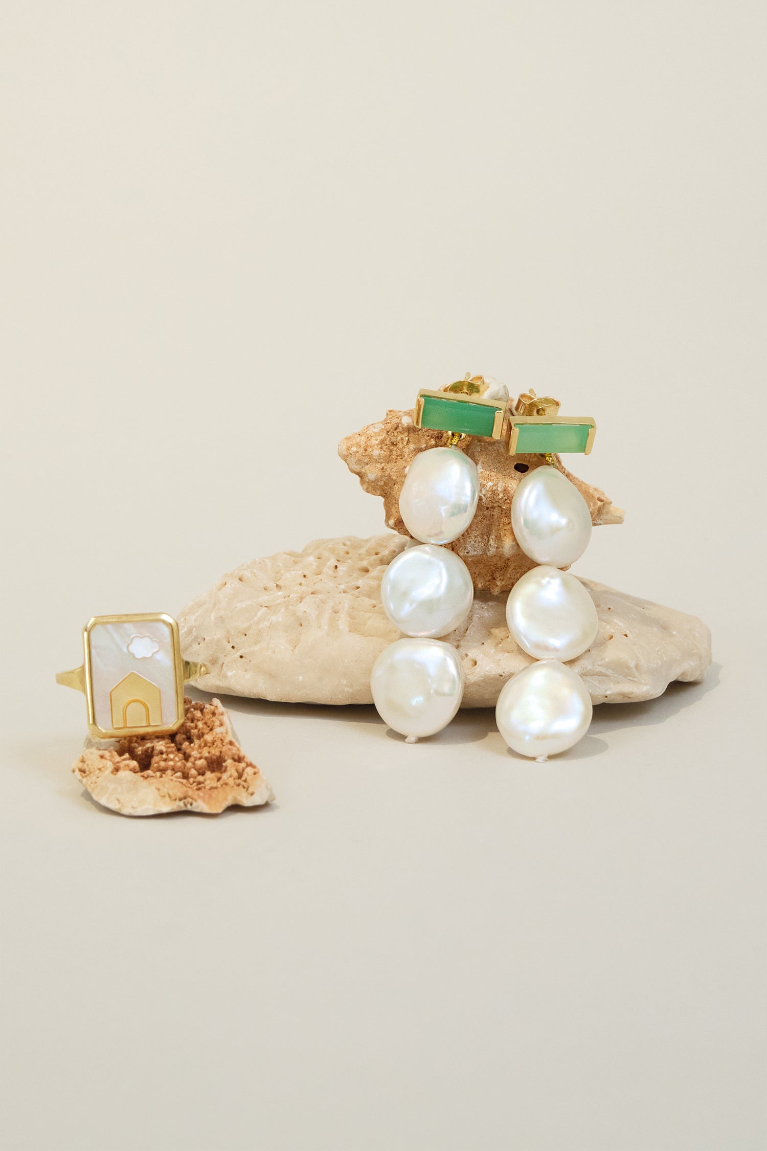 Deco Maxi Baguette Perla earrings shine with the vibrant glow of chrysoprase maxi baguette stones. Three luminous white pearls cascade gracefully beneath, adding delicate movement and a touch of sophistication. Inspired by the serene colors of the sea, this design balances boldness with elegance, making it the perfect accessory to elevate both everyday and special occasion outfits.