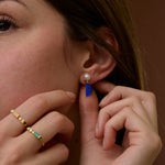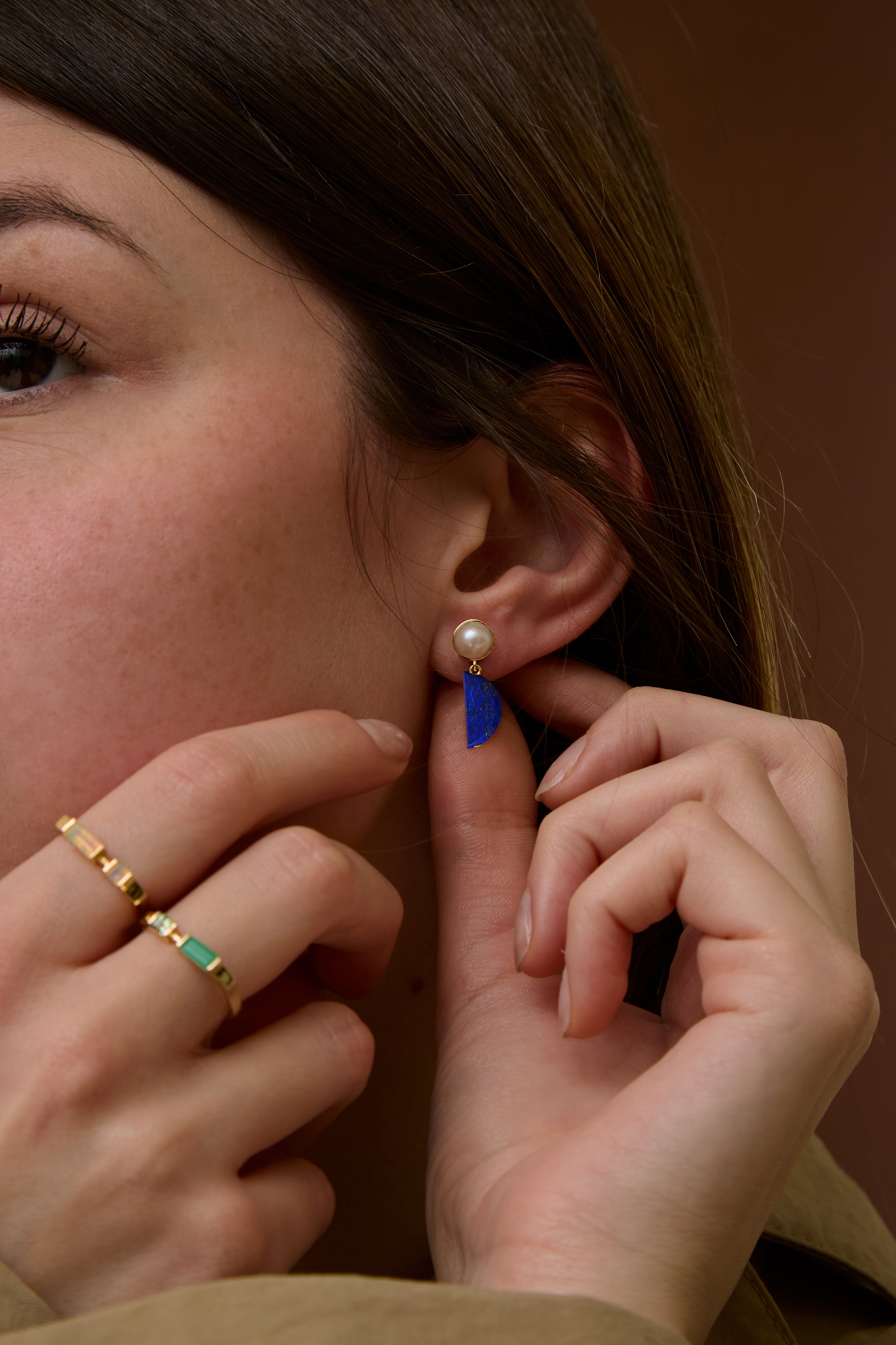 The Perla Empanada earrings pair classic white pearls with a deep blue lapis lazuli, softly curved in a half moon cut. Crafted in yellow gold, their silhouette adds just a hint of color and calm sophistication. The name “Empanada” reflects the stone’s gentle arc—unique and timeless.
