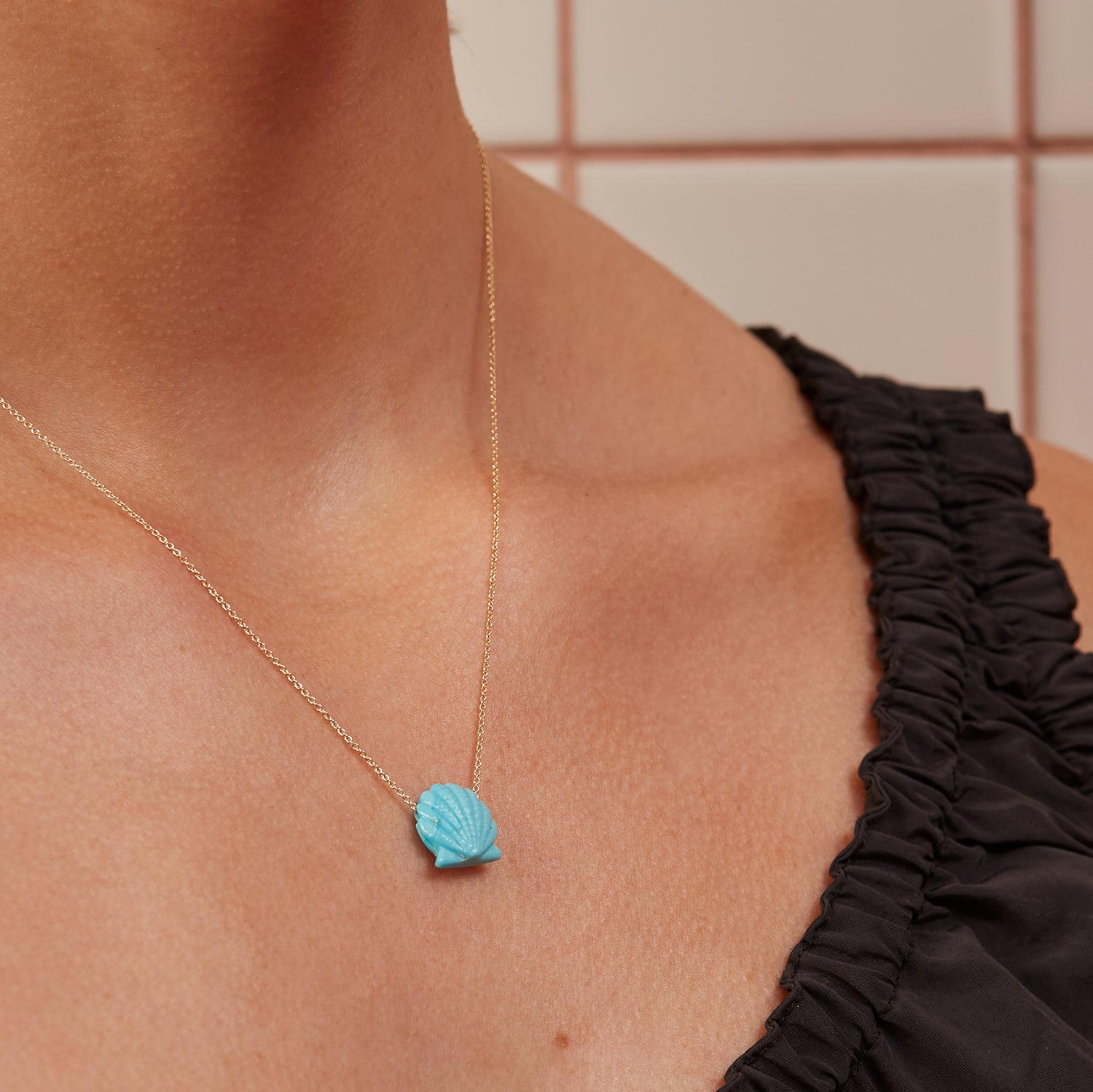 Our Concha (shell) necklace in now available also in a beautiful blue turquoise. Wear it everyday to feel like you are on vacation all the time! Explore the seaworld with us and try pairing this necklace with our Ballena Brillante (whale with diamond).