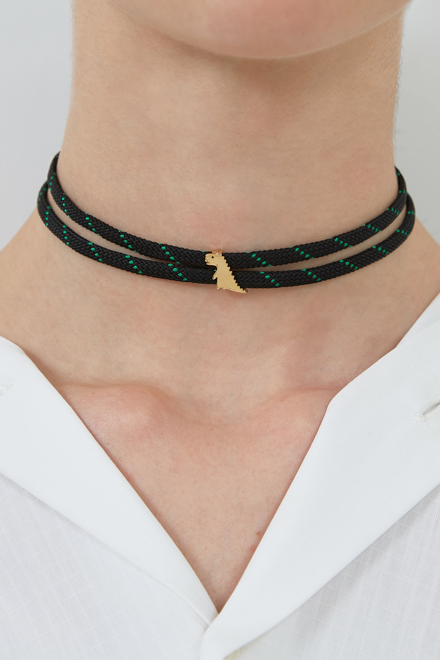 Our gold Dino Scout (dinosaur) necklace is a must-have for the modern adventurer. The black cord can be adjusted to create a choker, bolo tie, or double-wrap bracelet, while the polished dinosaur-shaped charm adds a touch of chicness.