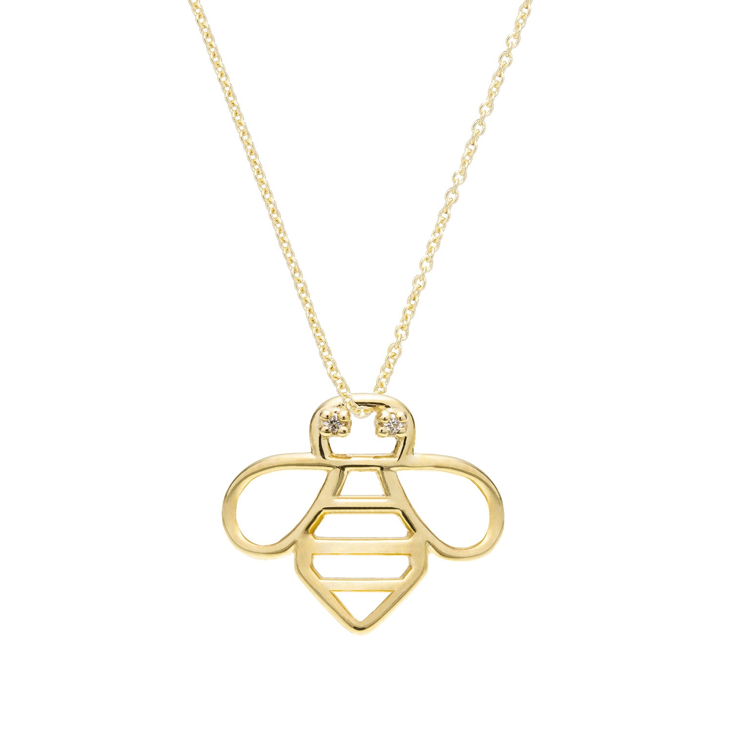 Our Bee Brillante gold necklace showcases a delicate bee charm, with sparkling diamond eyes that shimmer with life. Its form is gracefully crafted, capturing the essence of nature’s smallest wonders. A beautiful reminder of the beauty and resilience found in the world around us.