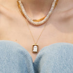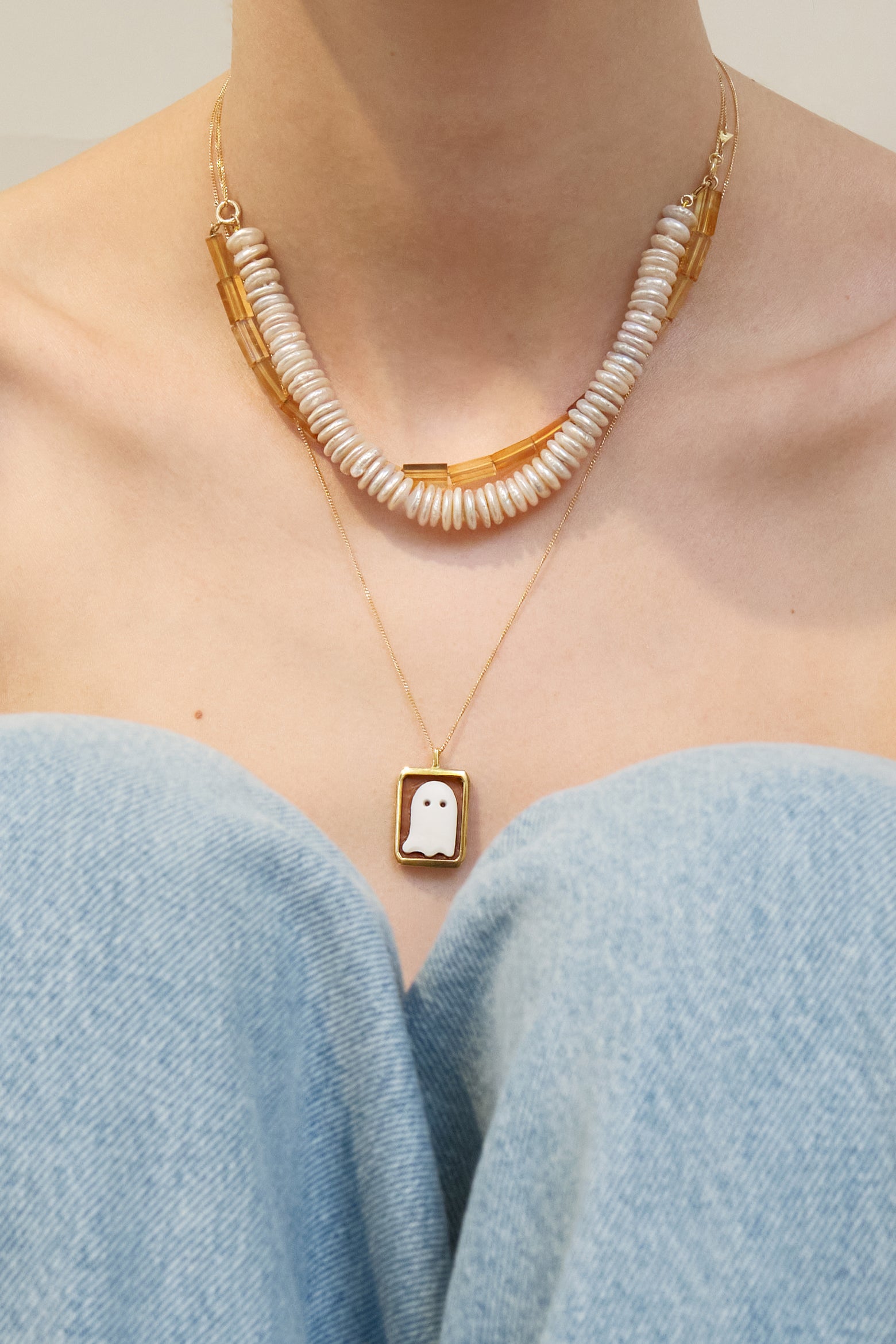 The Cameo Fantasma necklace features a hand-carved carnelian shell cameo depicting a playful ghost, framed in gold for a touch of timeless sophistication. Aliita reimagines the classic cameo technique with a modern, spooky-chic spirit. It's perfect for those who love pieces that whisper stories of craftsmanship, humor, and style. Wear it solo for a subtle statement or layer it to let your mysterious side shine.