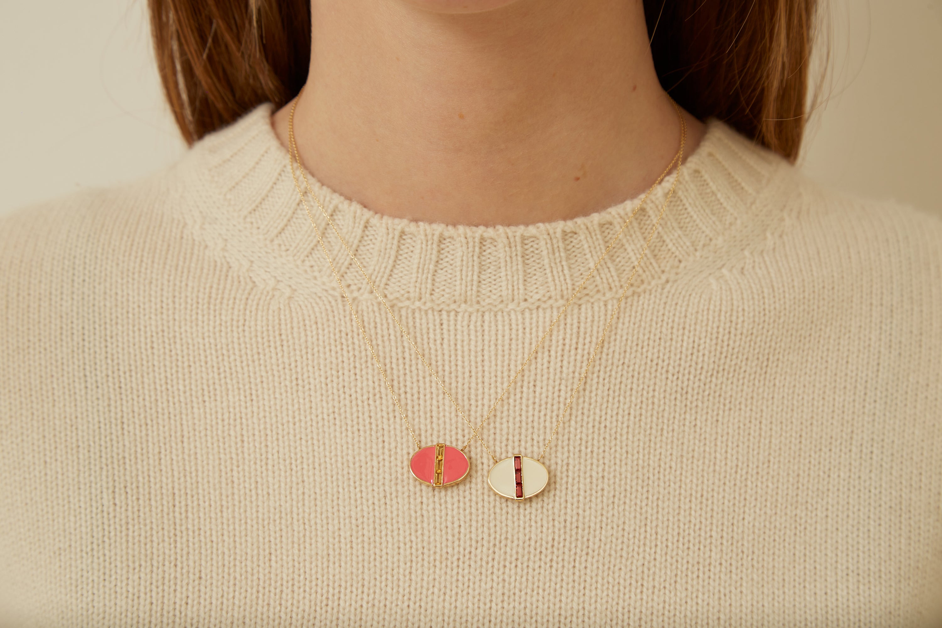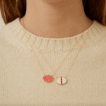 A necklace with garnet stones and white enamel. Deco Lago (lake) is Aliita's new line that evokes lakes due to its oval design.
