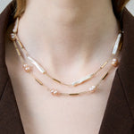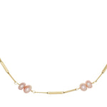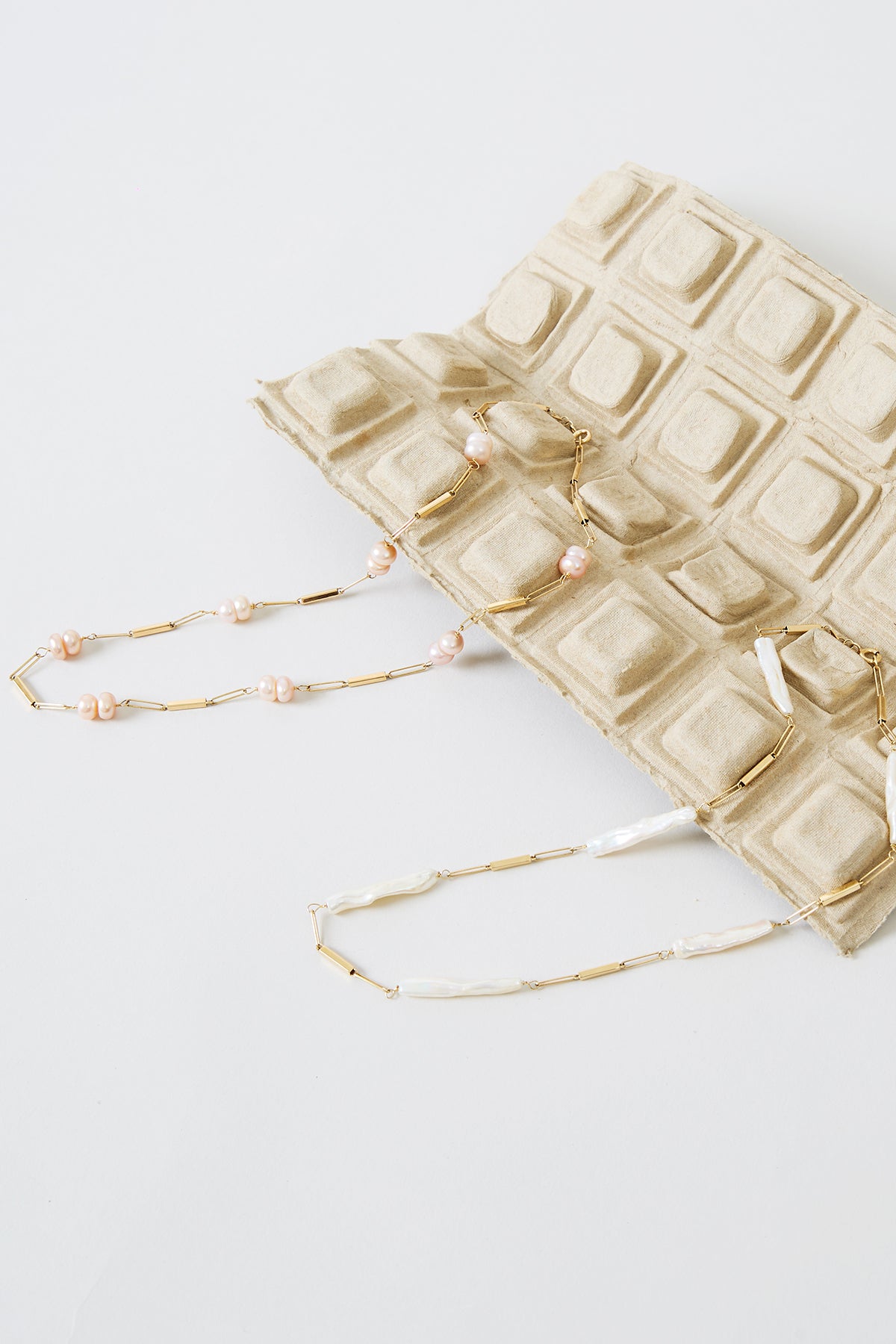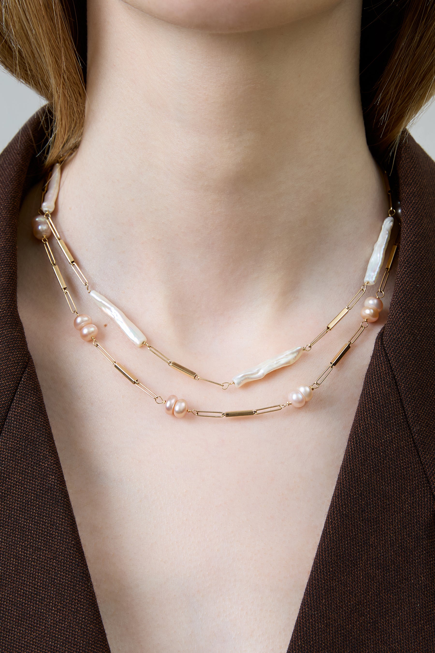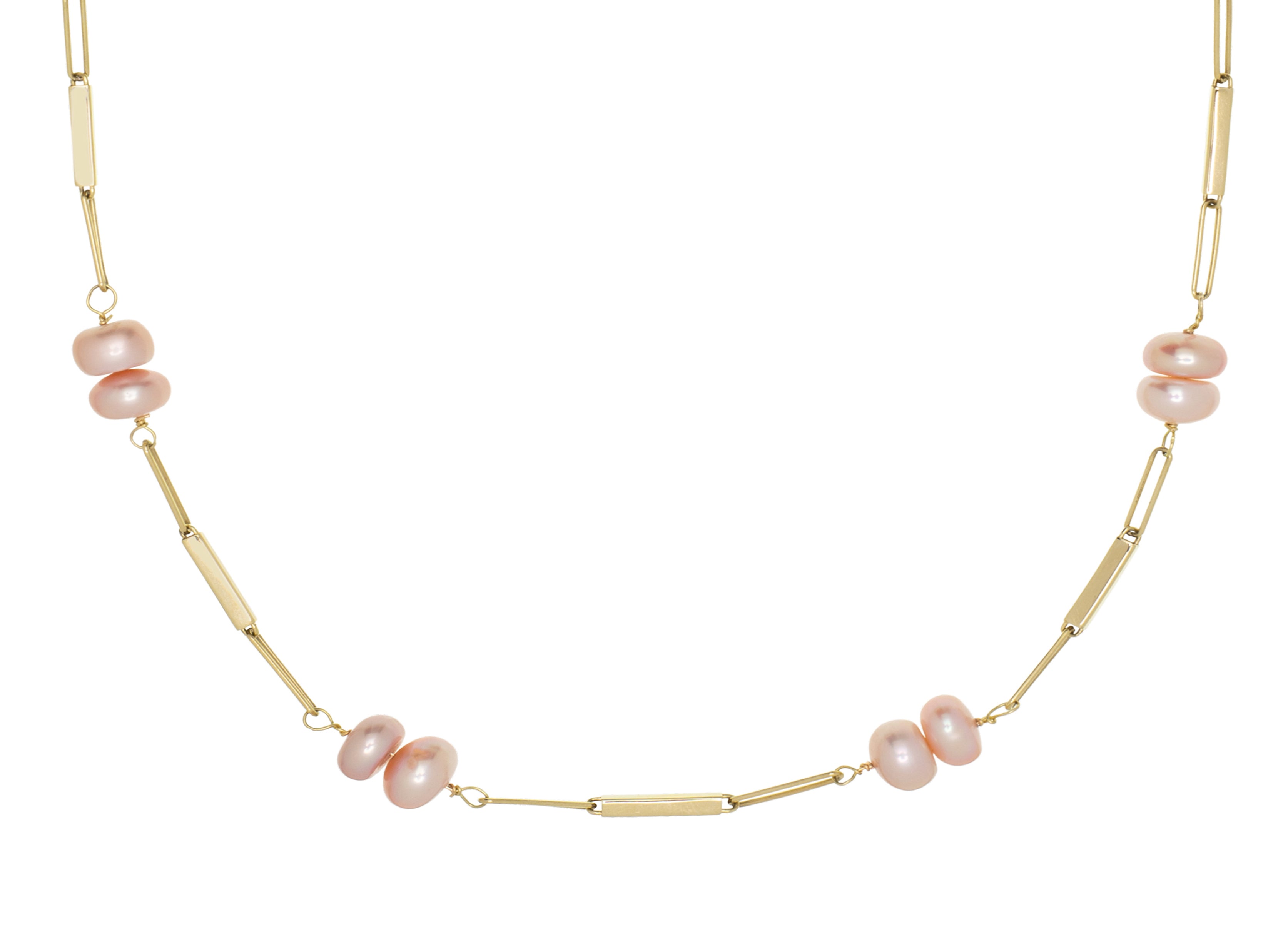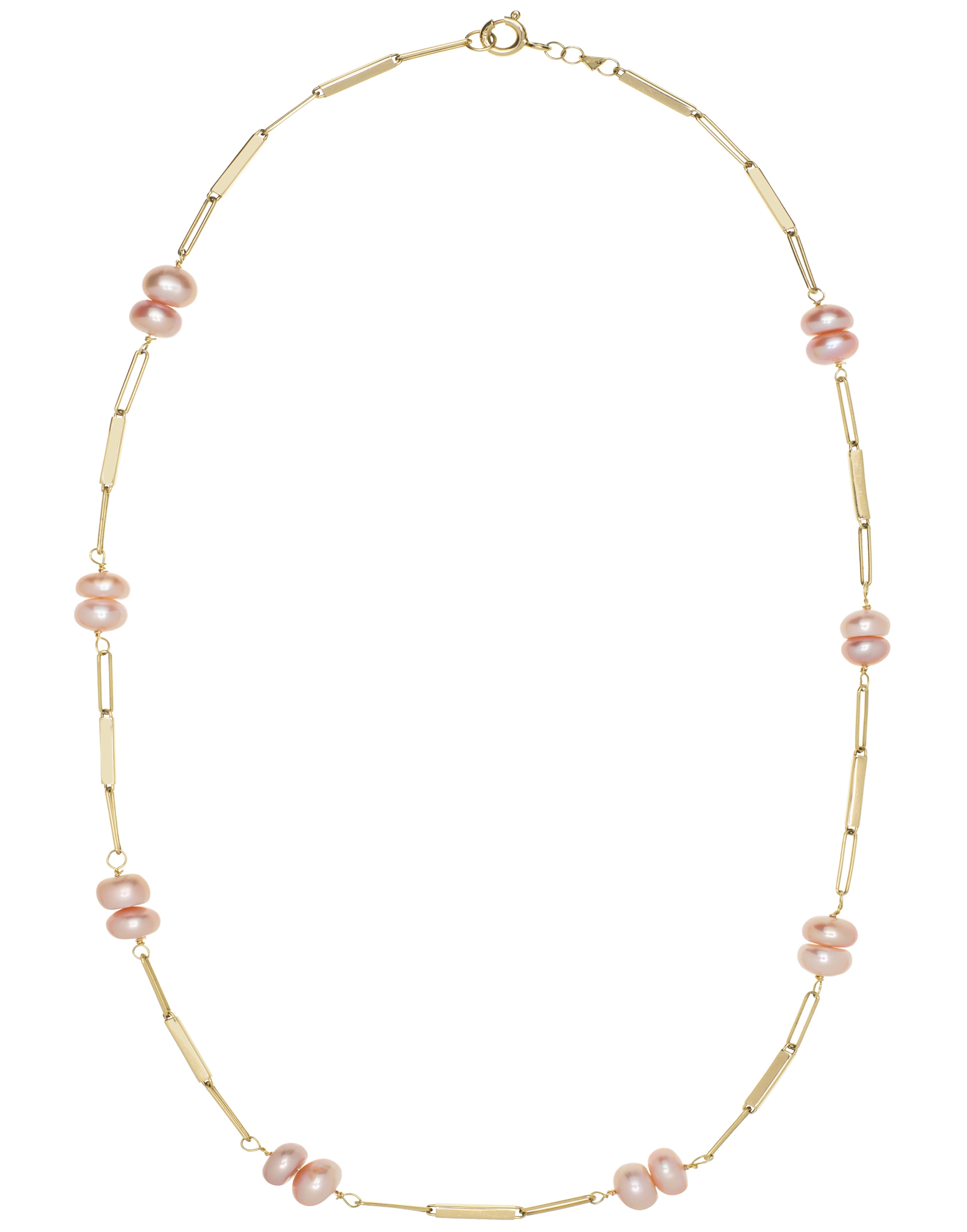 This edition of the Deco Tubitos design features delicate pink freshwater pearls, each one uniquely luminous. The soft blush tones of the pearls add a romantic glow, creating a timeless contrast with the necklace’s modern geometric form. A graceful fusion of vintage charm and contemporary edge, perfect for layering or making a quiet statement on its own.
