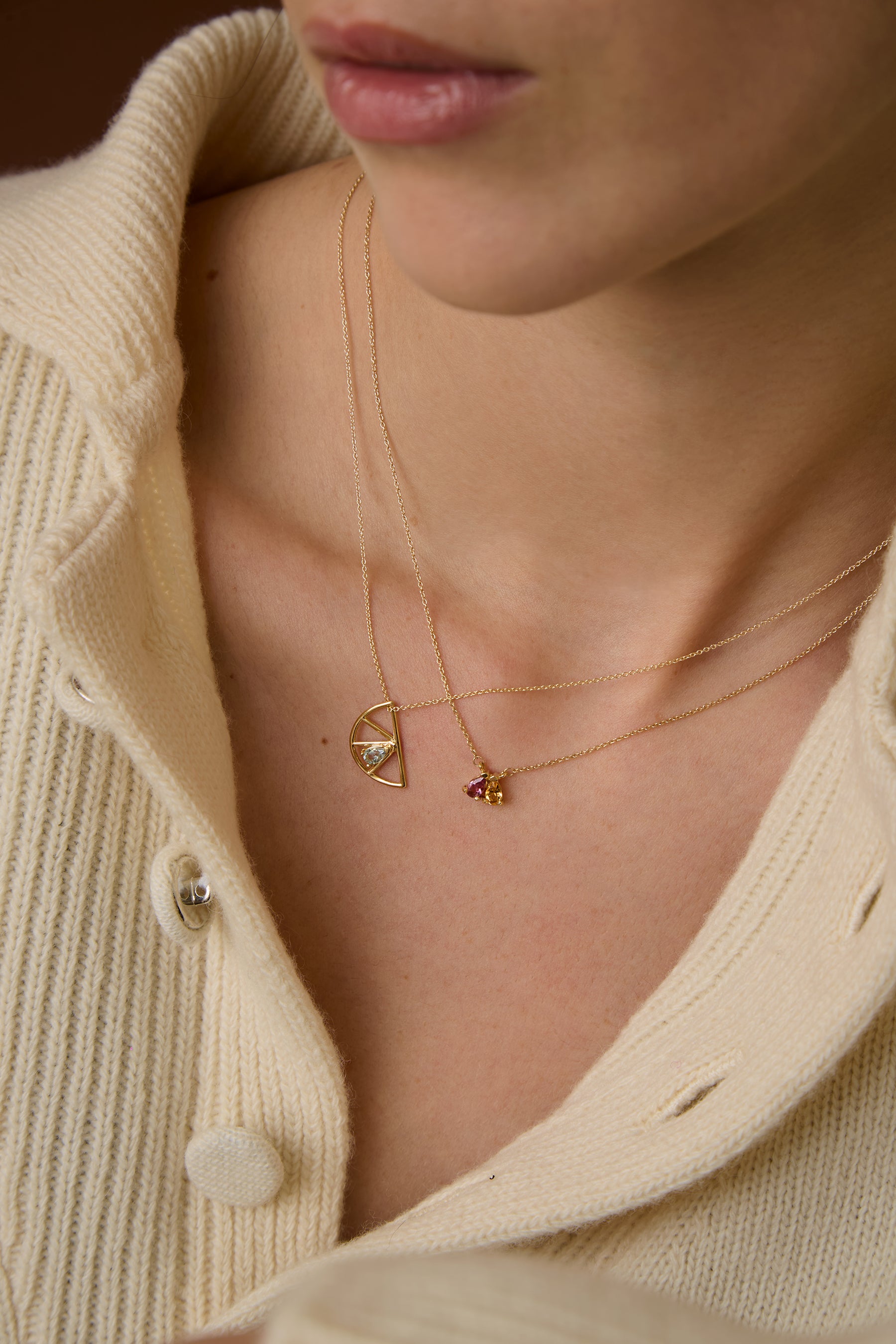 Serene and elegant, the Media Naranja Gota necklace reimagines the concept of soulmates through modern minimalism. Designed as a sleek orange slice, this piece features a luminous pear-cut aquamarine—symbolizing clarity, calm, and emotional connection. A subtle tribute to the one who complements you, or the peace you find within.