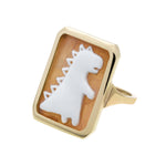 9kt yellow gold Cameo Dino ring with a dinosaur hand-carved in a carnelian shell cameo