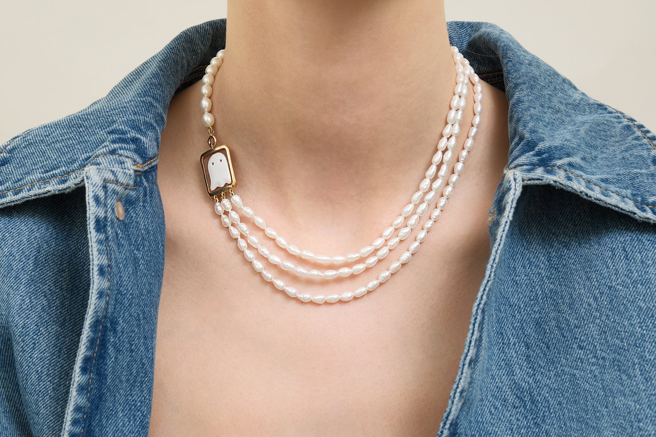 Where classic meets fun, this statement necklace turns tradition on its head with a hand-carved carnelian shell cameo of our whimsical Fantasma (ghost), floating in a cascade of luminous white pearls. A modern tribute to vintage elegance, the warm tones of the cameo bring a bold contrast to the soft iridescence of the pearls, creating a piece that feels both timeless and entirely unexpected. Wear it when you want your jewelry to speak for you: refined yet playful.