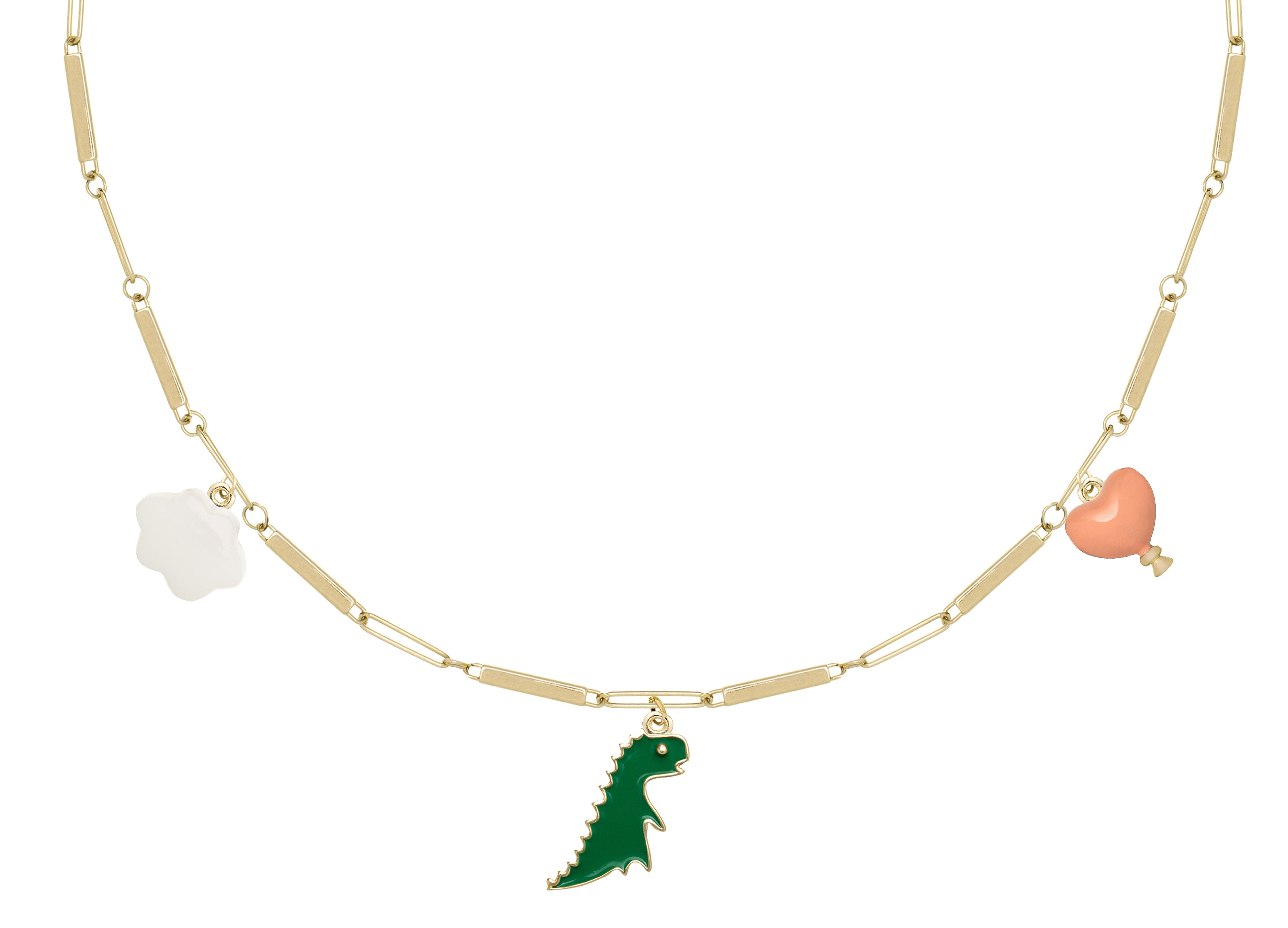 Deco Tubitos is a joyful celebration of color and imagination, a necklace that dances between playfulness and sophistication. Its signature tubular chain holds three charming pendants: a white coral cloud, a dinosaur, and a heart-shaped balloon, each one capturing a moment of wonder. Crafted in yellow gold, this piece adds a subtle touch of fantasy to everyday elegance. Wear Deco Tubitos to bring a smile to your style, a reminder that jewelry can be both precious and full of fun.