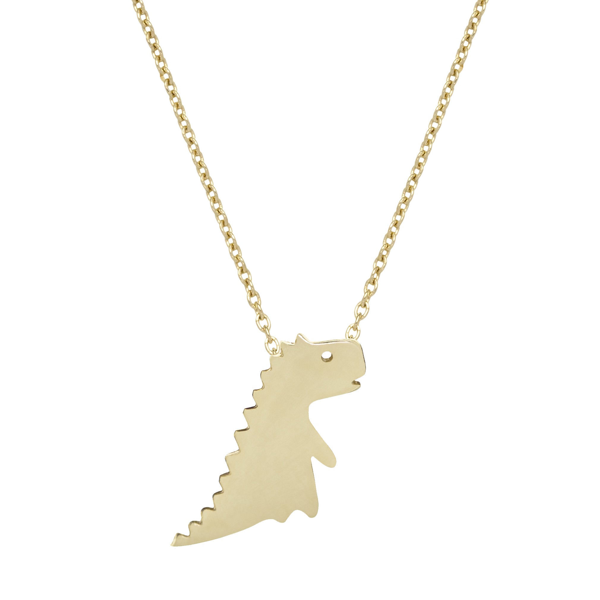 This polished gold dinosaur-shaped pendant shines with sophistication, showcasing a bold yet minimalist design. The Dino Bold necklace combines playful charm with timeless style. Perfect for those who embrace adventure and unique design, it’s a perfect addition to any jewelry collection.