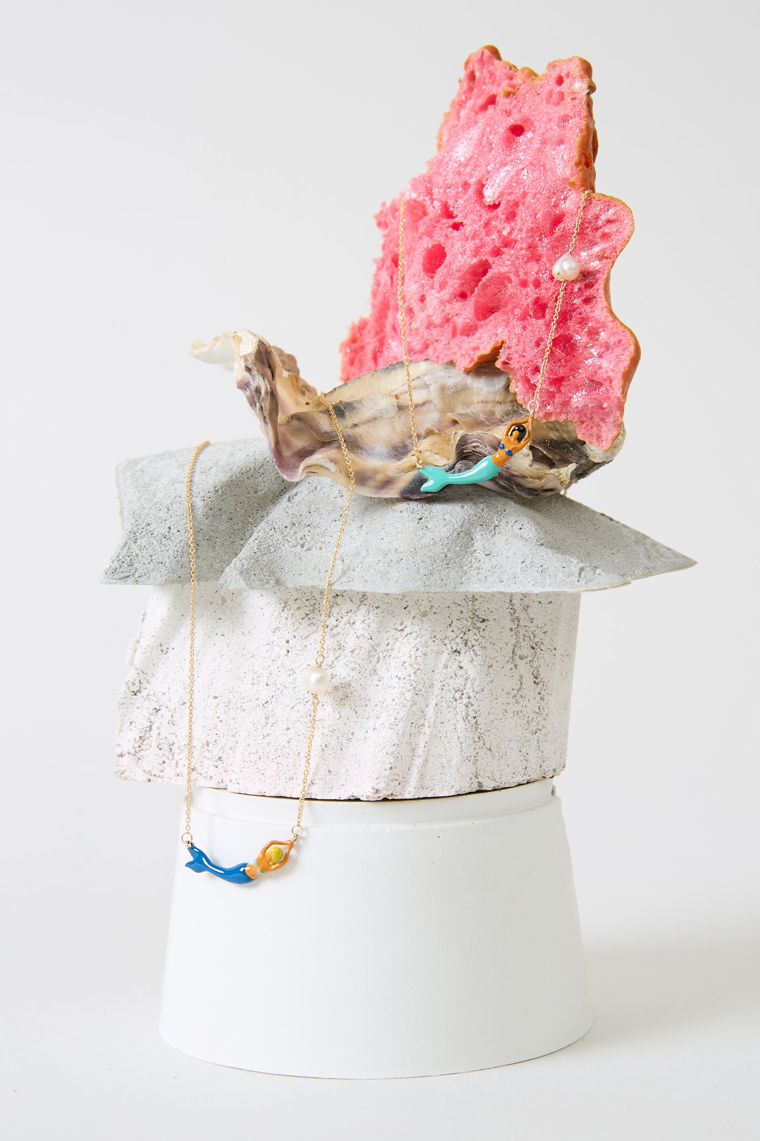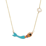 An ode to quiet waters and summer dreams. Our Mermaid, with her soft aqua enamel tail and flowing brunette hair, evokes calm and wonder. A natural pearl floats above her like a little bubble carrying a wish. Wear it as a reminder of life’s simple beauties.