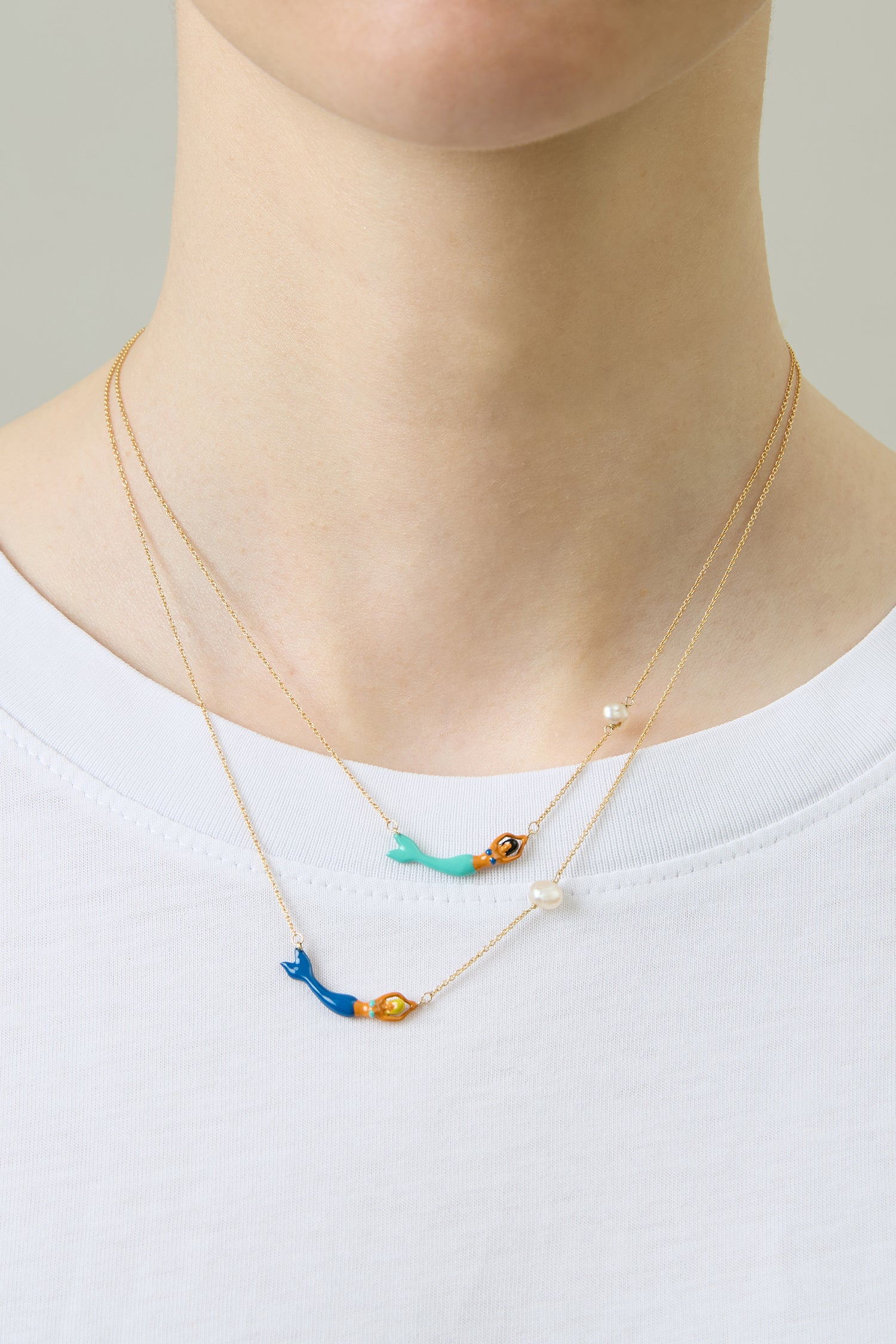 Material: 9kt yellow gold, Freshwater pearl, Hand-painted in aqua blue and electric blue enamel