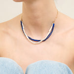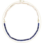 This necklace is made to transform and surprise. It features three distinct elements: white pearls that catch the light with every turn, deep blue lapis lazuli stones strung on a semi-rigid 9kt gold wire, and a fine 18kt gold box chain. The combinations are endless. Pair the chain with pearls for a luminous contrast, or wear the lapis strand for a cleaner, more graphic look. Worn together, the pearls and lapis become a striking choker necklace. And when you connect all three you get a long, flowing silhouette that moves effortlessly from day to night. As a final twist, both the pearls and lapis can wrap around your wrist, transforming into bracelets. It’s a piece designed to follow your mood!