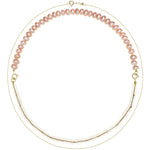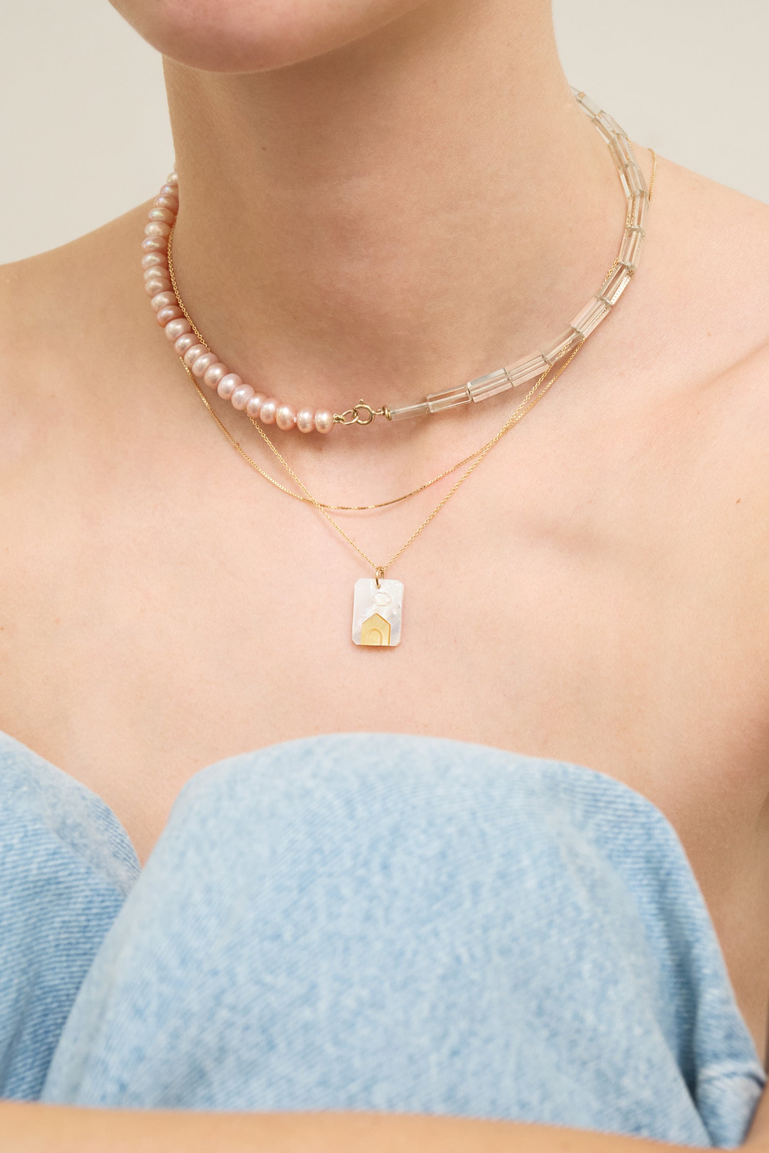 A necklace that adapts to you! This playful piece is made of three separate elements: a soft string of pink pearls, a semi-rigid line of sheer green amethysts threaded on a durable 9kt gold wire, and a delicate 18kt gold box chain. You can wear it in so many ways, and that’s exactly what we love about it. Try pairing the chain with the pink pearls for a feminine touch. Or swap the pearls for the green amethyst strand — its semi-rigid shape brings a more geometric feel. Feeling bold? Combine the pearls with the amethysts and wear them as a choker necklace. And when you want it all, just connect all three for a long piece. And here’s a little secret: the pearl and amethyst strands can also wrap around your wrist and become bracelets.