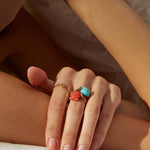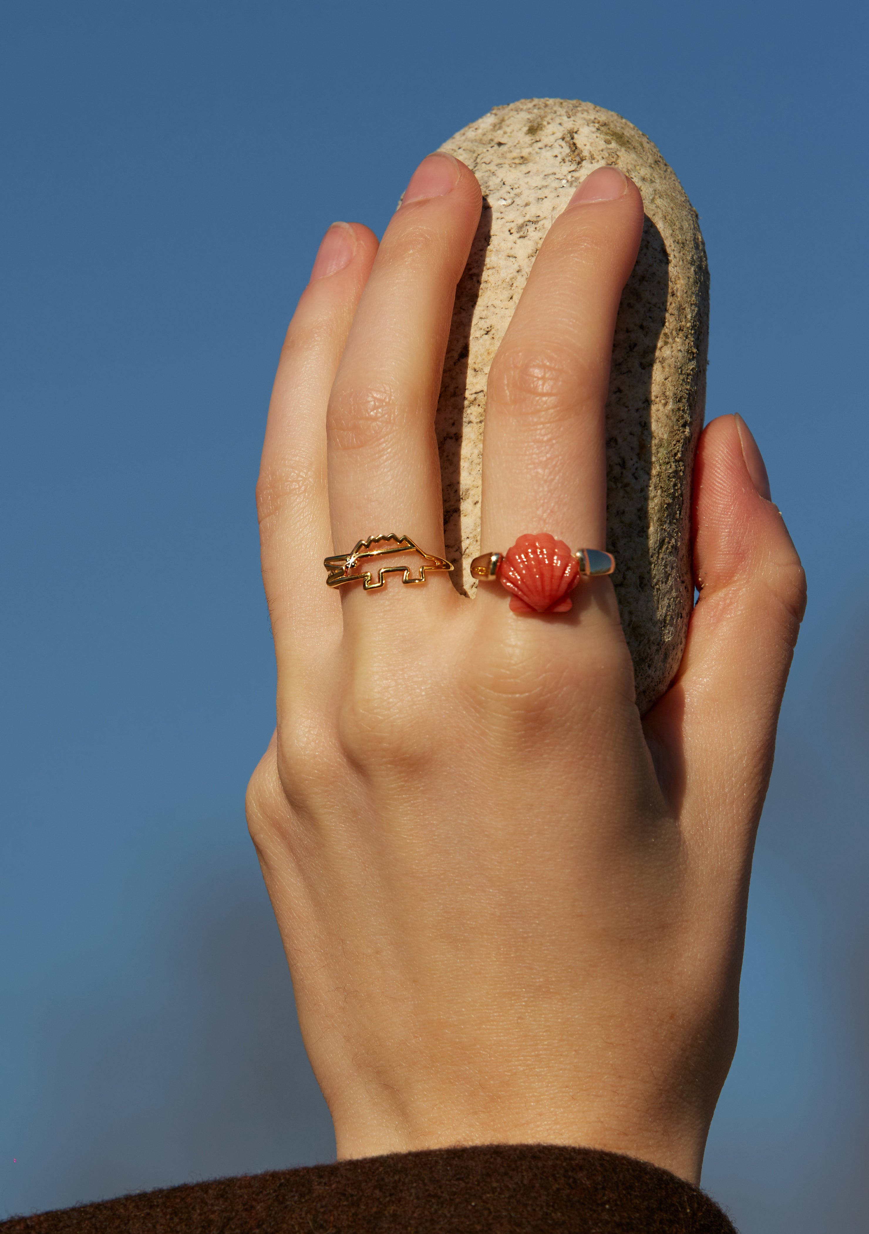 Hand wearing a crocodile shaped gold ring with diamond and a gold ring with a shell in red coral