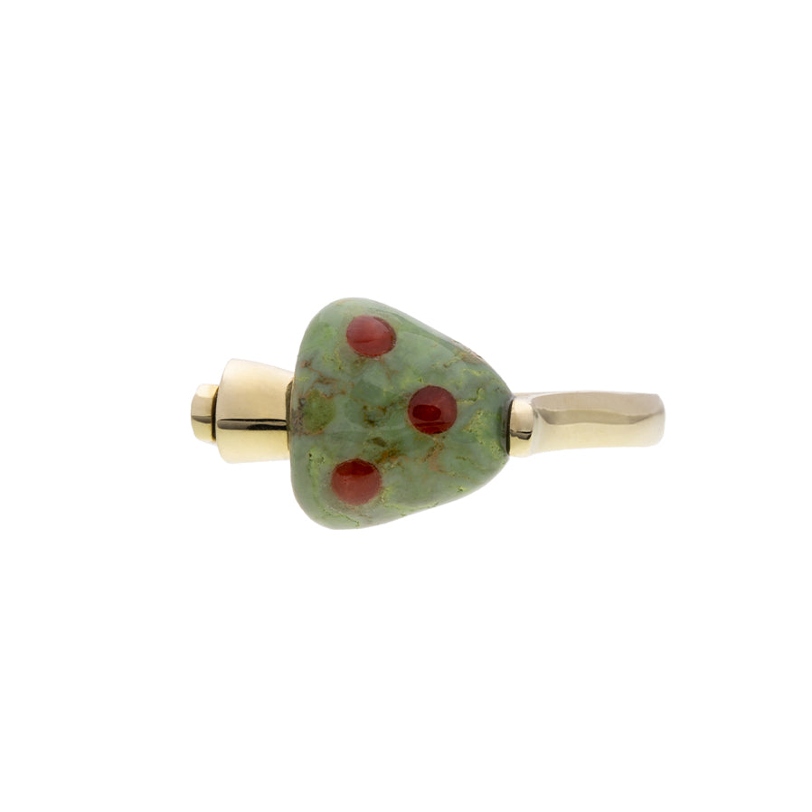 The Amanita mushroom ring in yellow gold paired with oxidized green turquoise and red coral is a quirky accessory that brings a special touch to any outfit!
