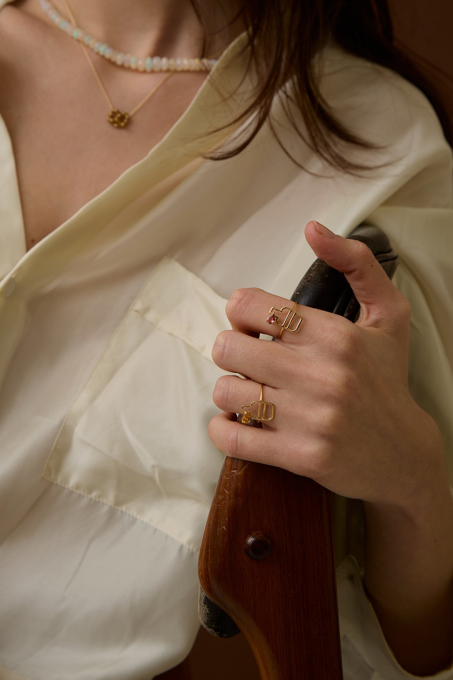 Soft and striking. This Perfume Gota ring, shaped as a little perfume bottle, features a pear-cut pink tourmaline — a tender pop of color held in gold minimalism. Delicate, yet full of character.