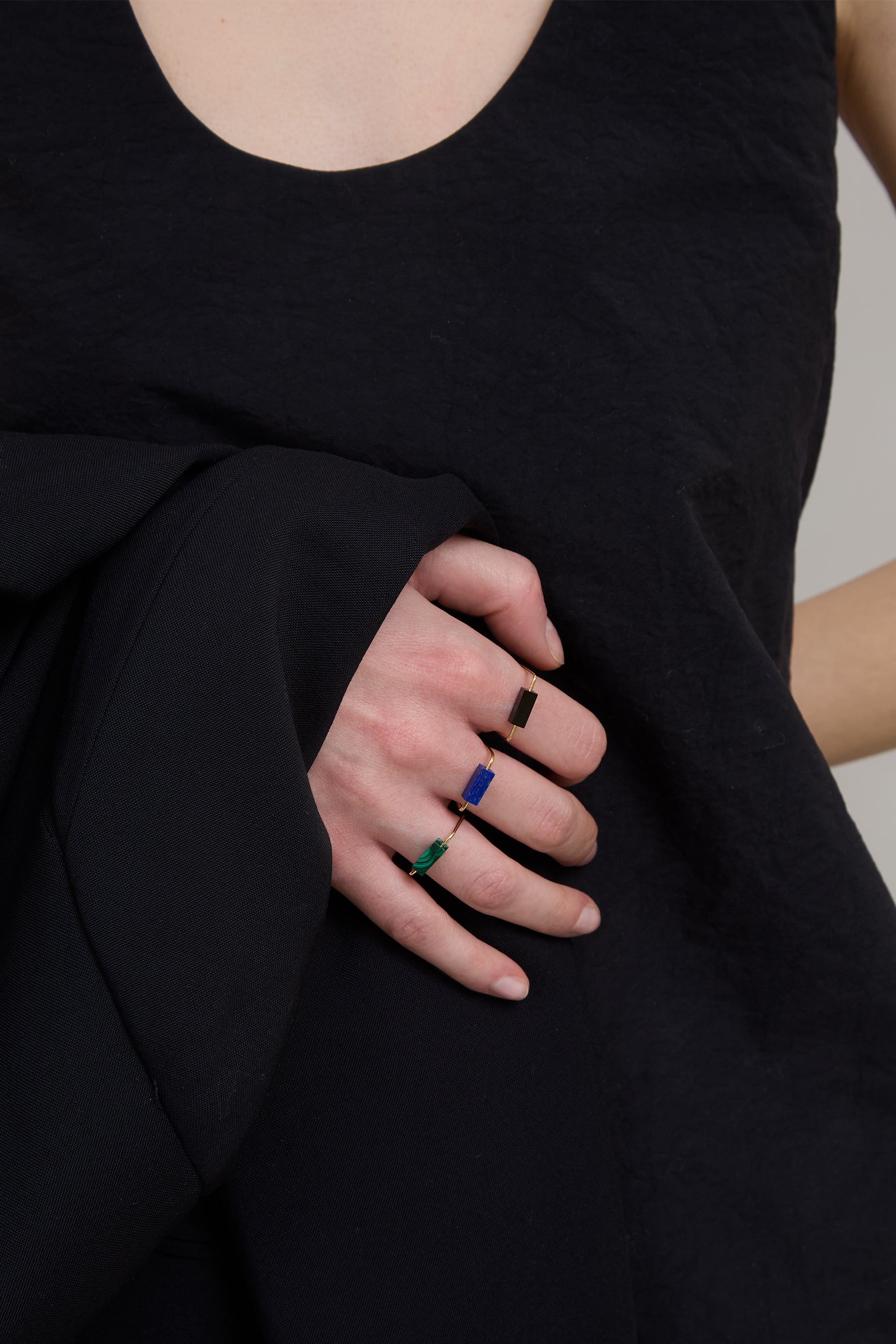 Crafted from a single golden thread, this ring forms a square that feels both fluid and architectural. A vivid malachite stone—striped with swirling greens—passes through the center, offering a vibrant contrast to the gold’s glow. A natural symphony of energy, elegance, and earthiness.