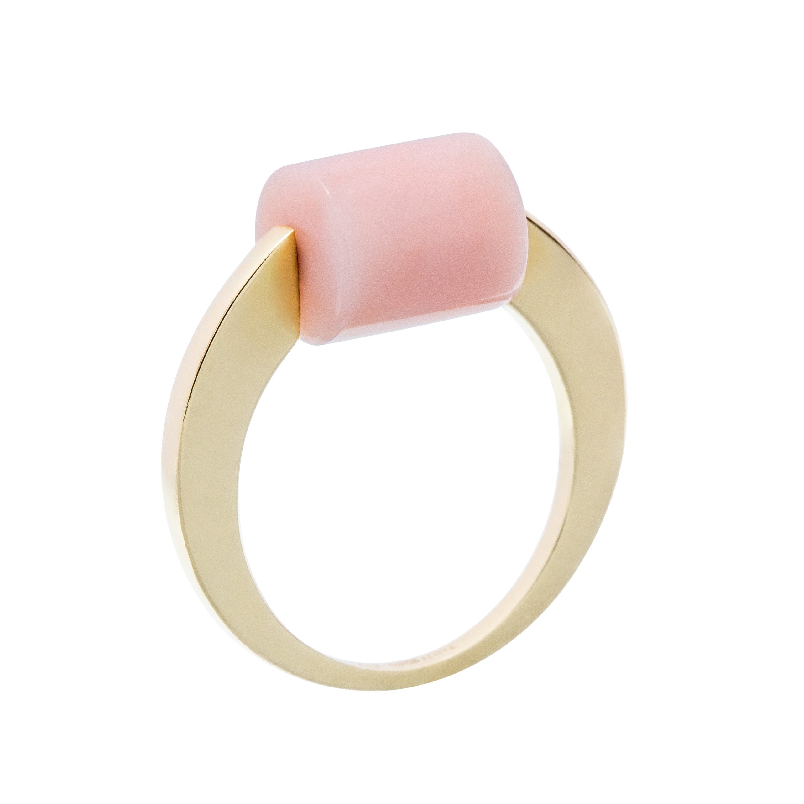 Un anello dalla forma inedita: l'oro giallo è accompagnato da una pietra opale rosa in forma cilindrica che renderà più originale il tuo look! Ti consigliamo di indossare questo anello insieme ai nostri Deco Cilindro Agata Nera e Deco Cilindro Malachite.