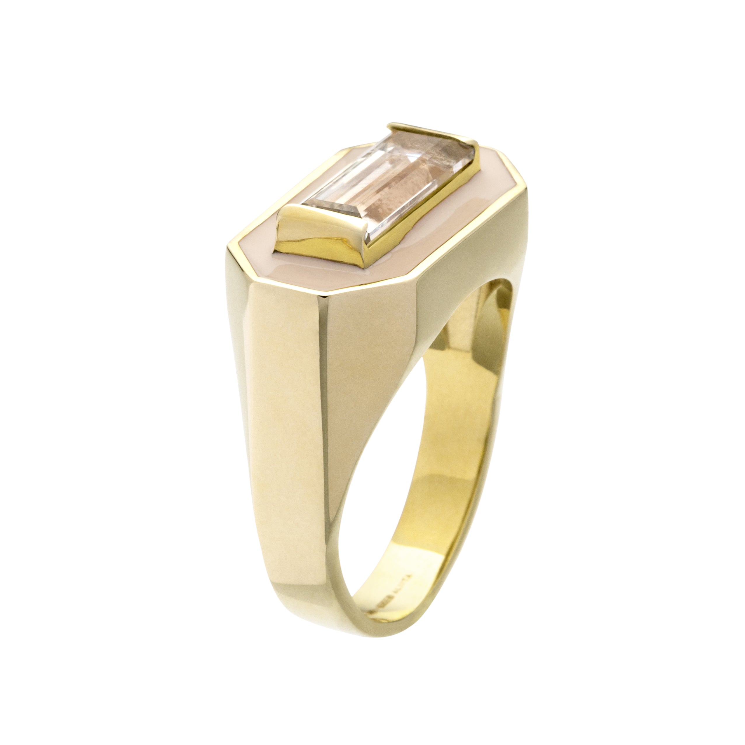 Gli anelli Deco Maxi Baguette con smalto accuratamente dipinto a mano e brillanti gemme preziose offrono un’interpretazione fresca e contemporanea dell’estetica Art Deco. Qui smalto in bianco cocco dipinto a mano e pietra ametista verde. Divertiti indossando più anelli insieme per un mix "bold"!