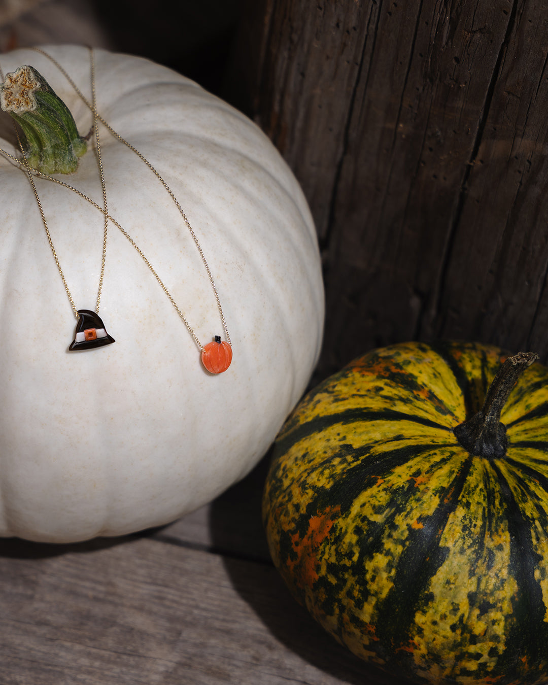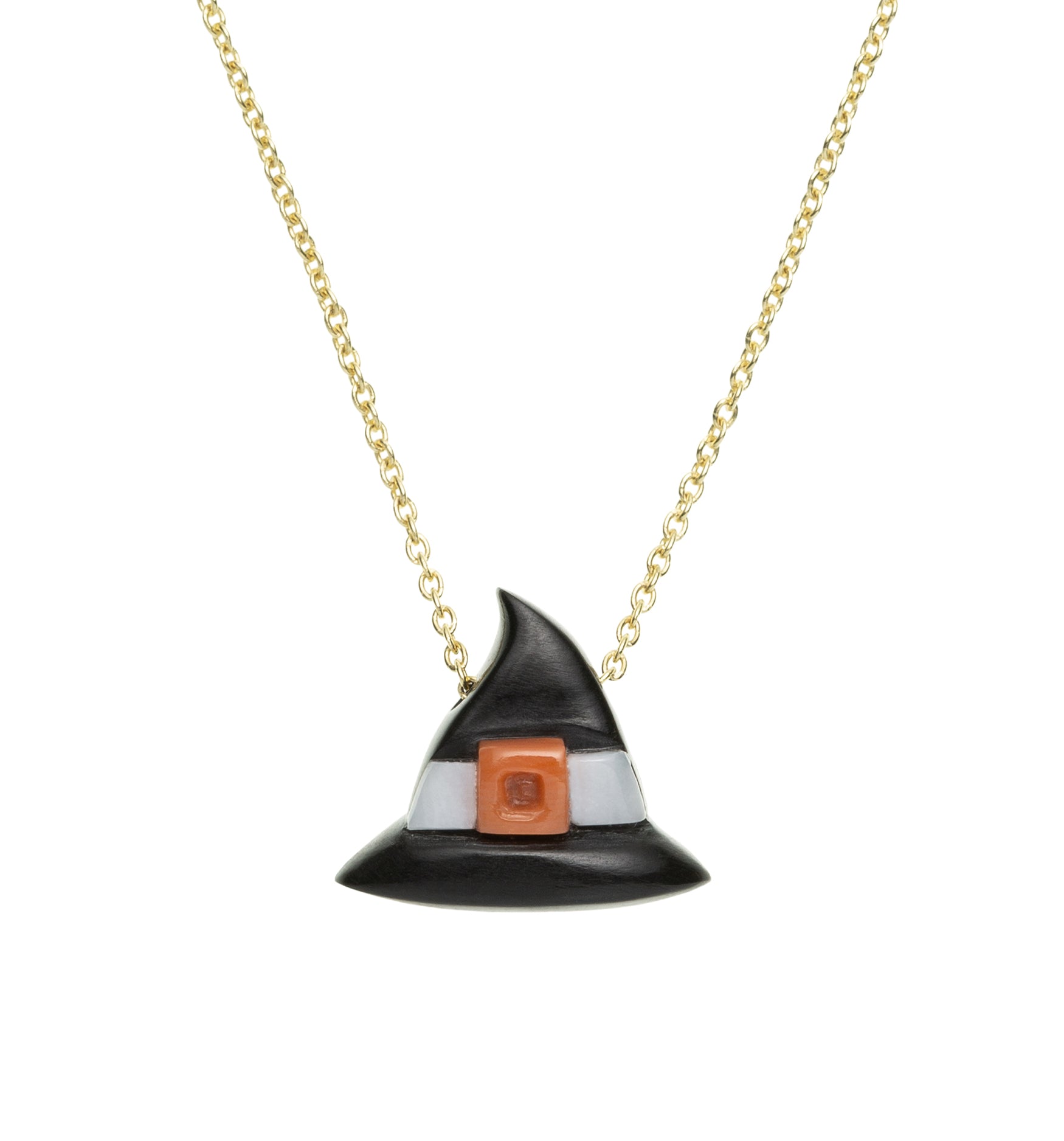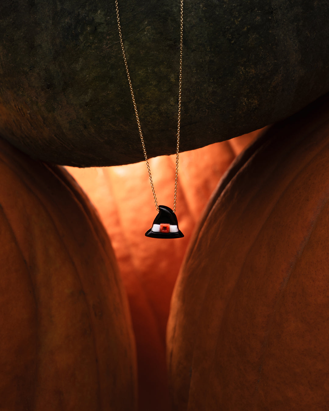 Spolvera il tuo calderone e indossa la nostra Bruja, una collana con cappello da strega in corallo marmo nero. Preparati con noi per la notte di Halloween!
