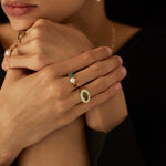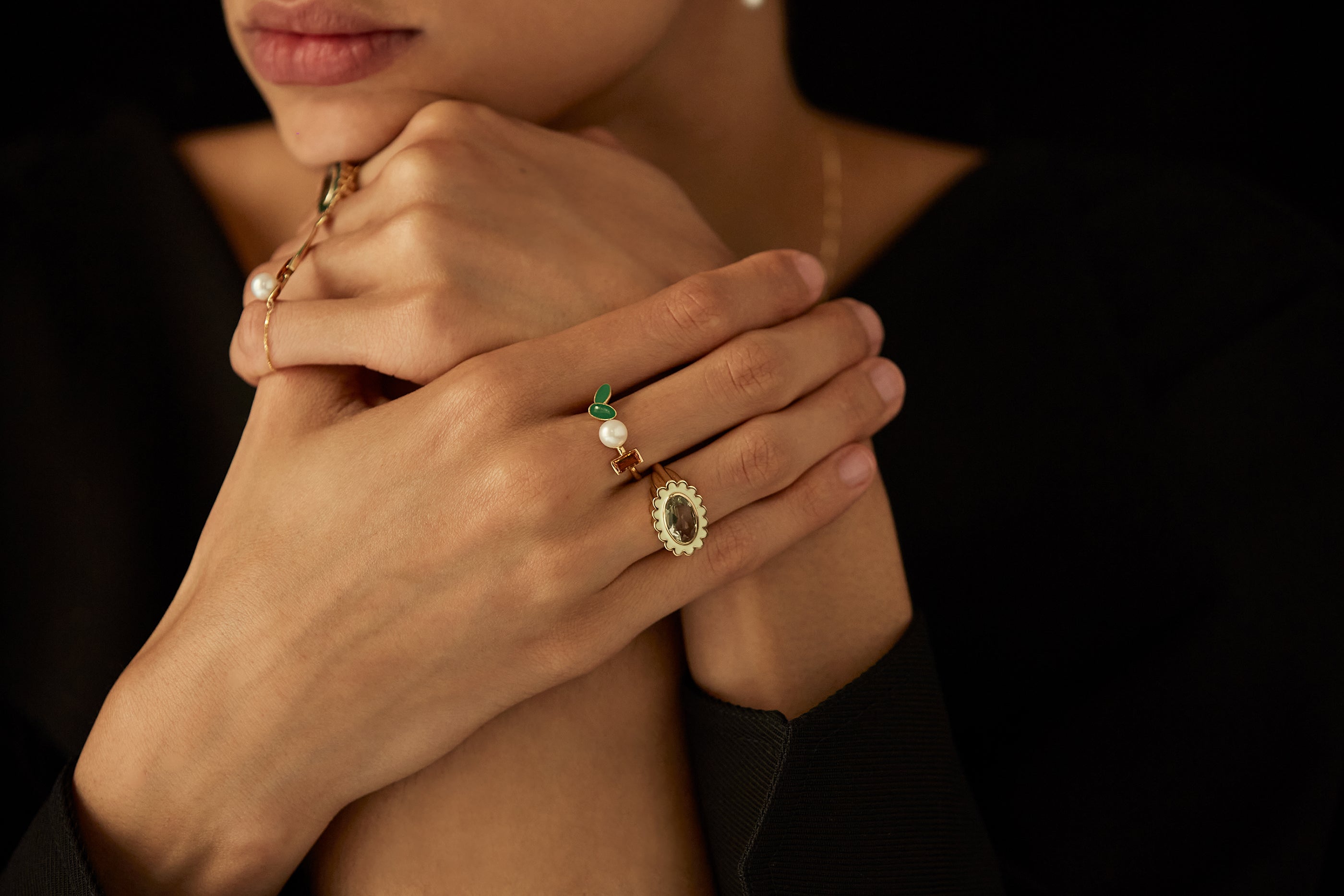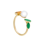 L'anello Petalos Flor è una rappresentazione delicata ed estremamente elegante di un fiore, dalle linee astratte con perla e baguette citrino.