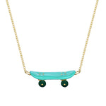 La collana Skate è caratterizzata da un ciondolo a forma di tavola da skateboard, smaltato in azzurro acqua con ruote verdi dal tocco vivace. Un piccolo simbolo di libertà e stile, perfetto per affrontare ogni giornata con leggerezza e personalità.