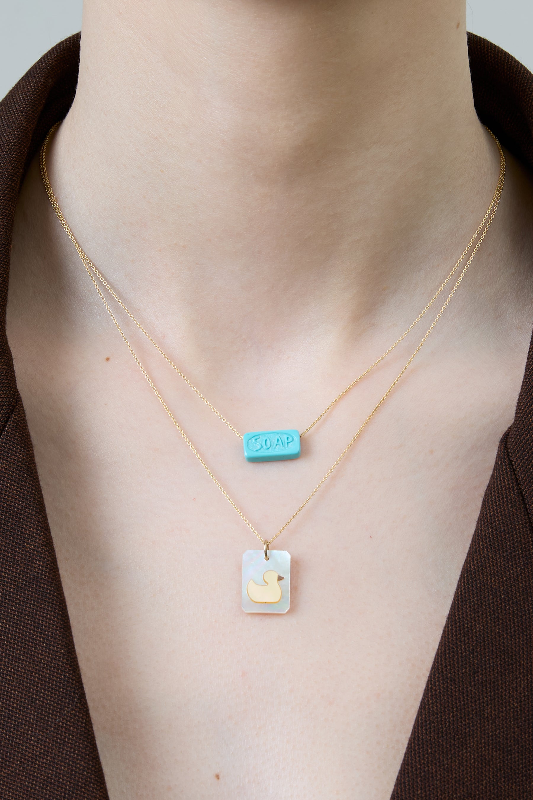 Una saponetta scolpita a mano in turchese e appesa a una catena in oro giallo. La collana Soap è un piccolo gioiello che ti farà sorridere! Un omaggio ai riti quotidiani, al momento del bagno e alla cura personale. Indossala da sola come un’icona di semplicità, o abbinala alla collana Cameo Perla Patito.