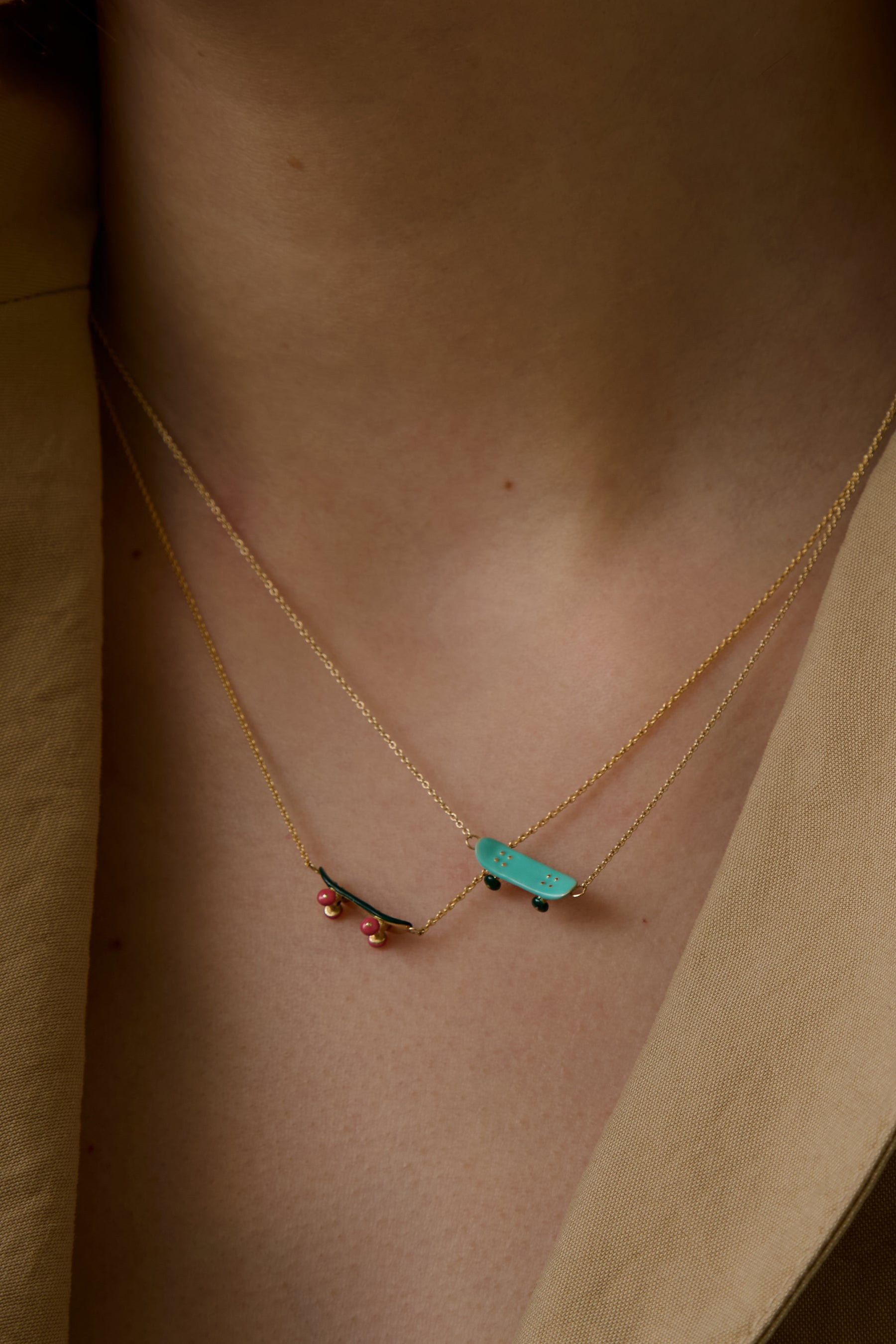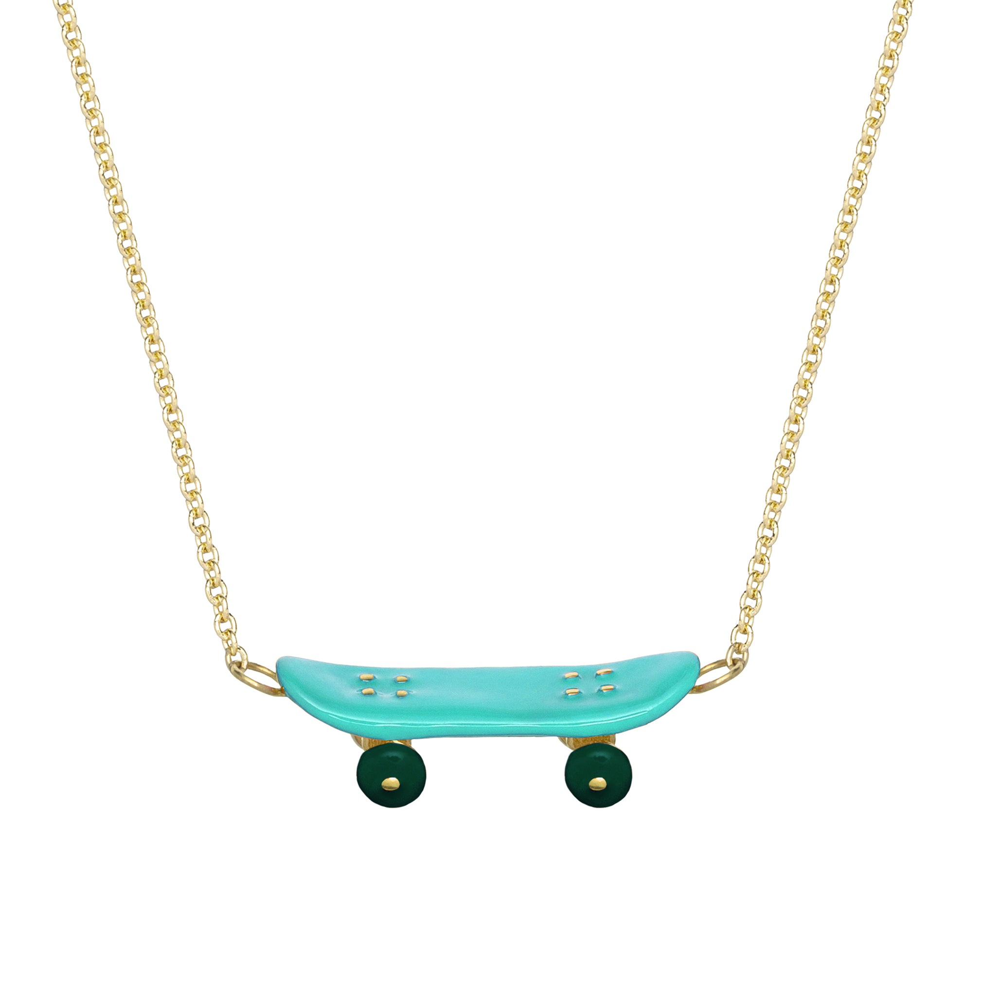 La collana Skate è caratterizzata da un ciondolo a forma di tavola da skateboard, smaltato in azzurro acqua con ruote verdi dal tocco vivace. Un piccolo simbolo di libertà e stile, perfetto per affrontare ogni giornata con leggerezza e personalità.