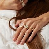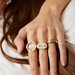 Gli anelli Deco Maxi Baguette con smalto accuratamente dipinto a mano e brillanti gemme preziose offrono un’interpretazione fresca e contemporanea dell’estetica Art Deco. Qui smalto in bianco cocco dipinto a mano e pietra ametista verde. Divertiti indossando più anelli insieme per un mix "bold"!