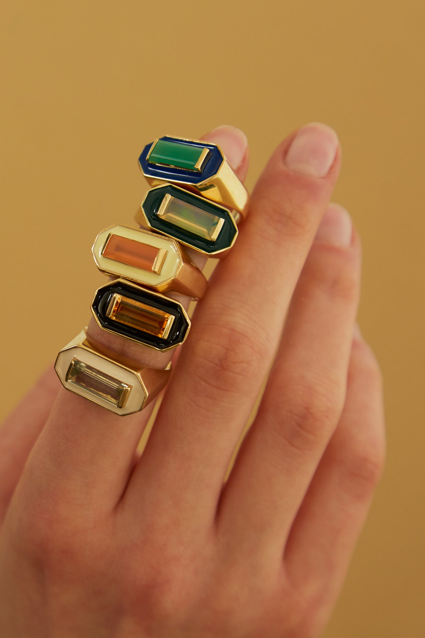 Anello Deco Maxi Baguette con pietra crisoprasio dalla splendida tonalità verde acqua, accompagnata da smalto dipinto a mano in blu elettrico.