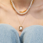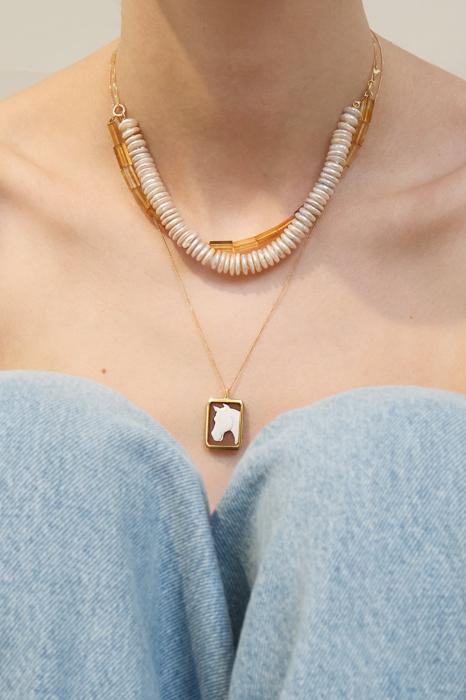 La collana Cameo Caballo presenta un cammeo in conchiglia corniola intagliato a mano che ritrae un maestoso cavallo, incorniciato in oro. Aliita rinnova la tradizione del cammeo con uno spirito moderno e raffinato.