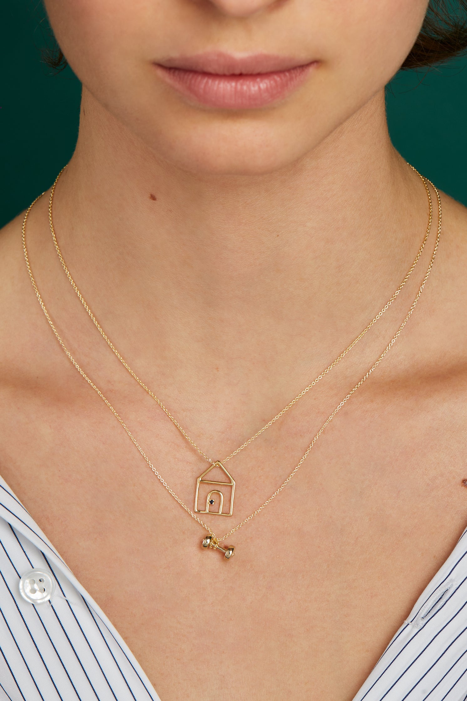Casita Zafiro Azul (casetta) è una collana che rappresenta la tranquillità e la calma, il suo zaffiro blu porterà la serenità del mare nella tua casa. Perché sia sempre piena di una luce brillante, indossala insieme alla Luz Baguette, la nostra lampadina con la pietra morganite in taglio “baguette”.
