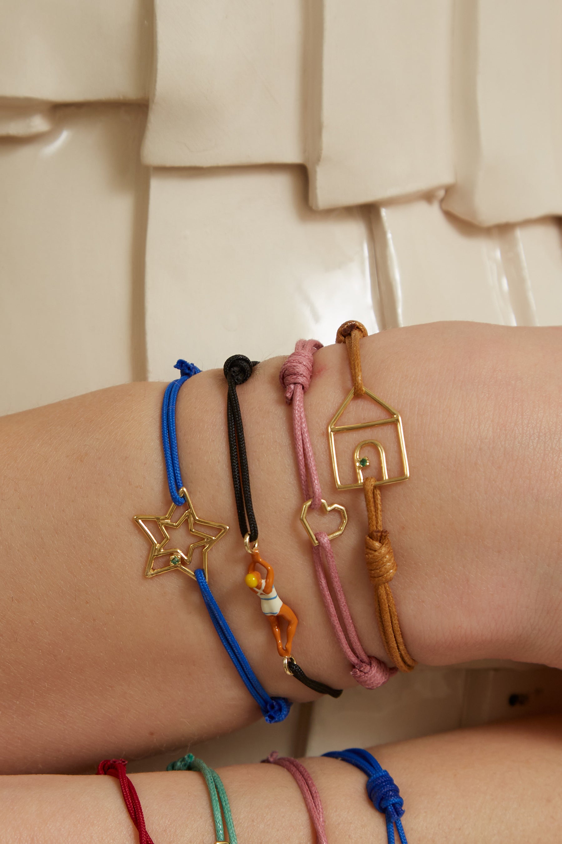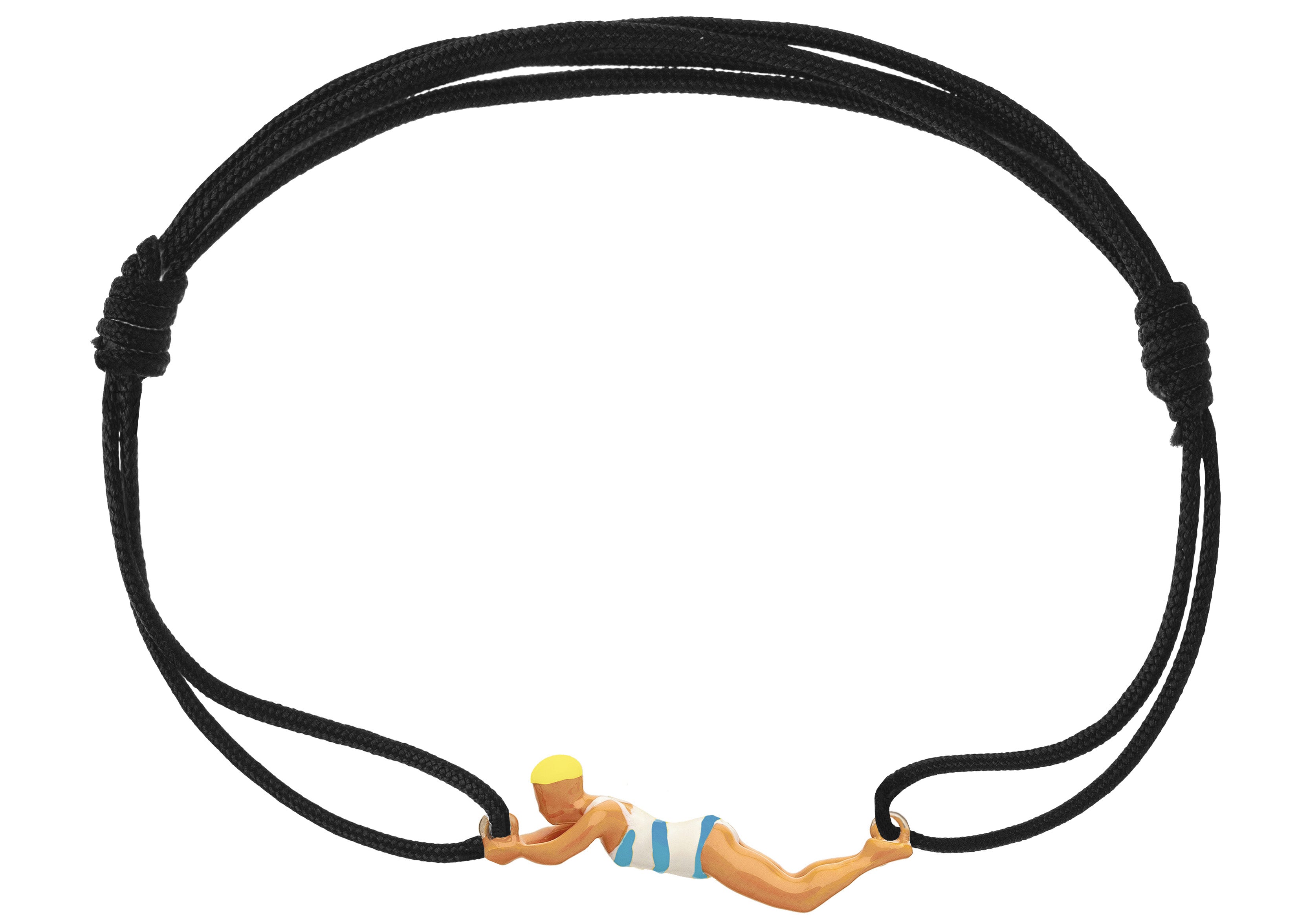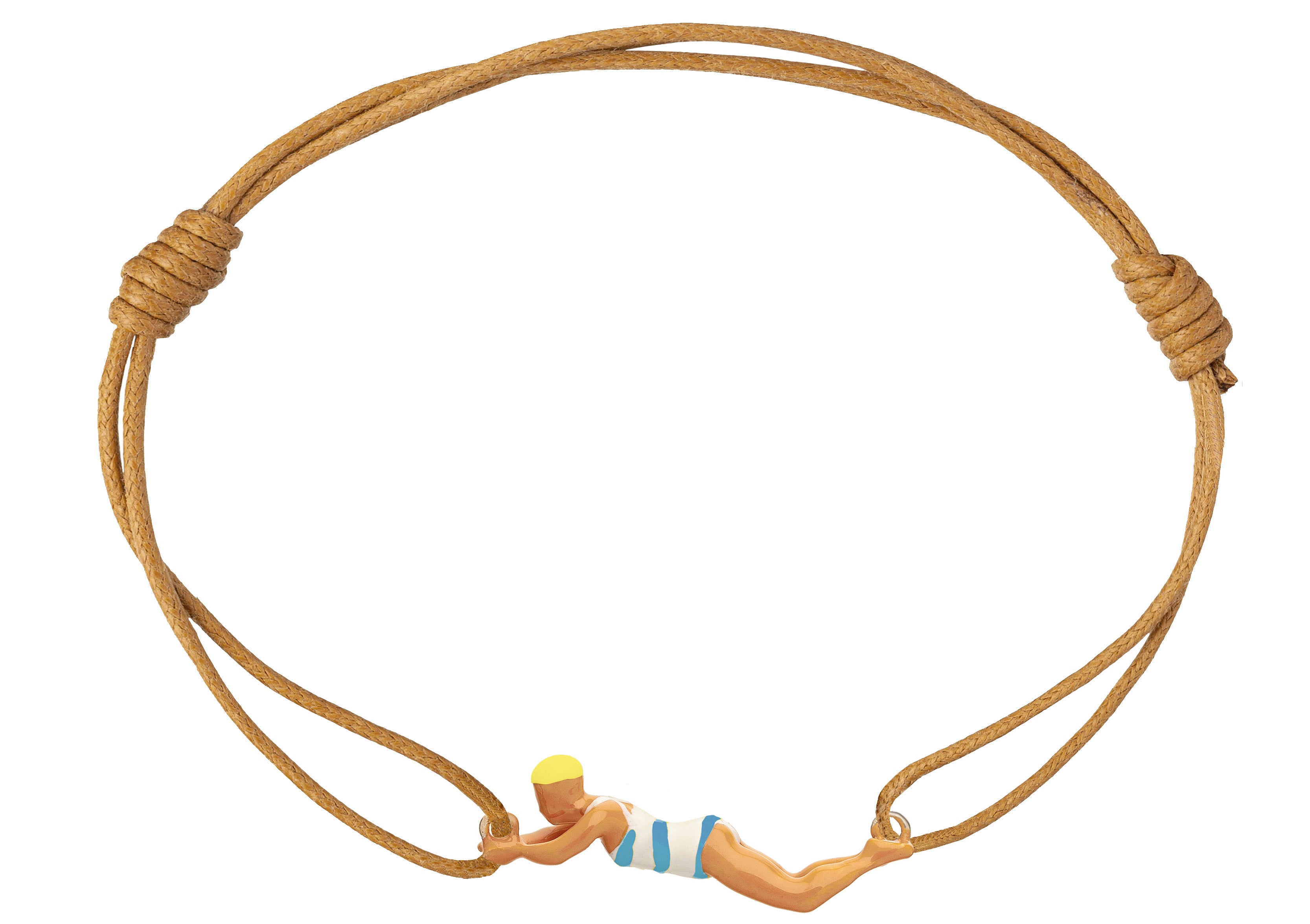 Material: 9kt yellow gold, Hand-painted enamel in sky blue and coconut white with yellow swim cap, 100% cotton cord / Eco in 100% recycled polyester