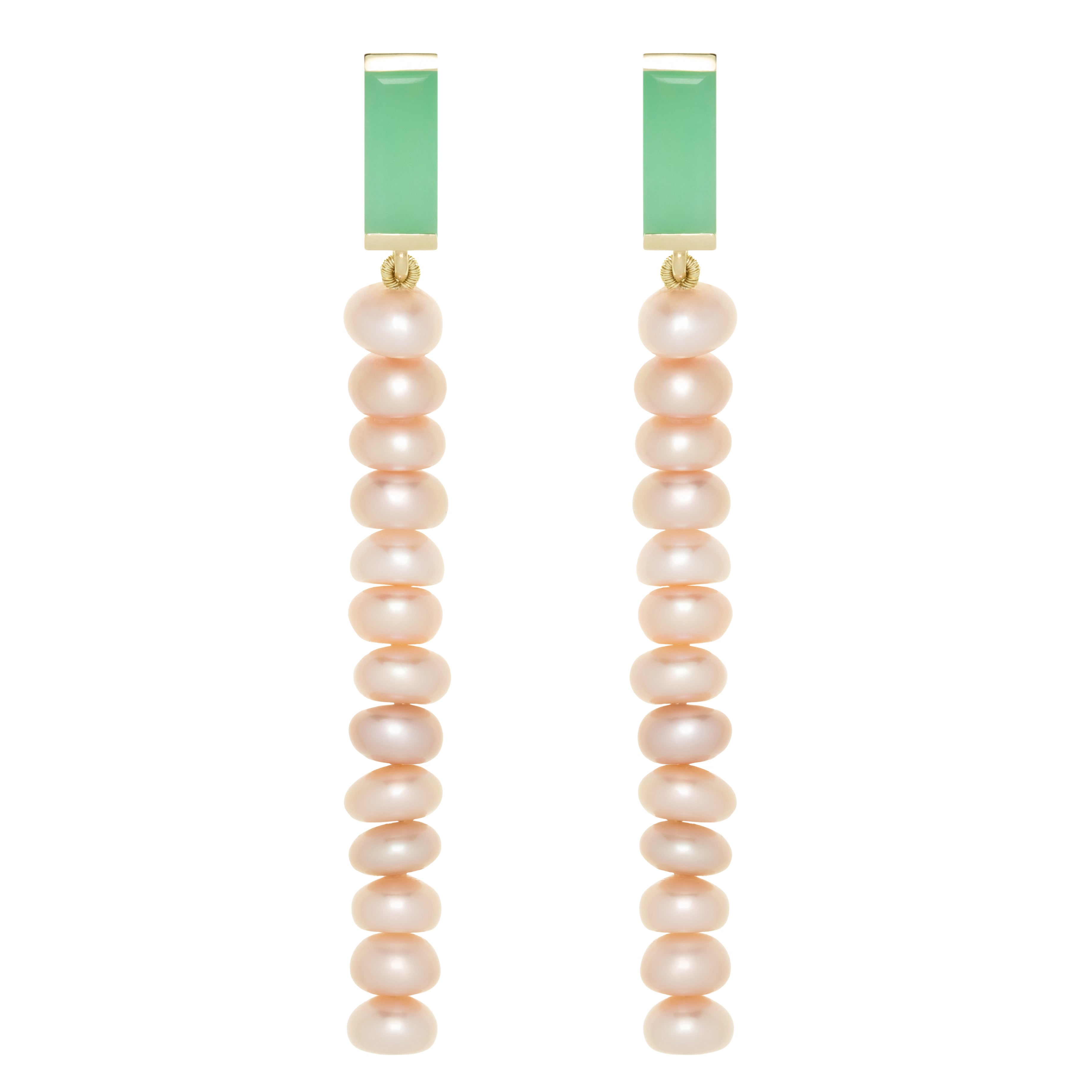 Material: 9kt yellow gold, 18kt yellow gold post backs, Chrysoprase stones in baguette cut, Freshwater pink pearls