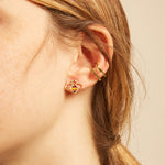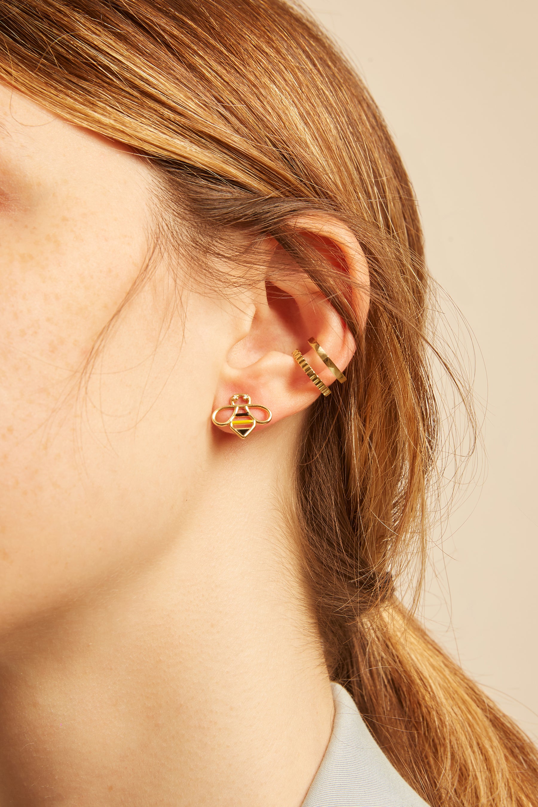 A gold single earring which features a delicate bee with diamond eyes that sparkle with elegance. Its body is hand-painted in vibrant black and yellow enamel, capturing the bee’s lively energy. A playful yet refined piece, it adds a touch of whimsy and charm to any look.