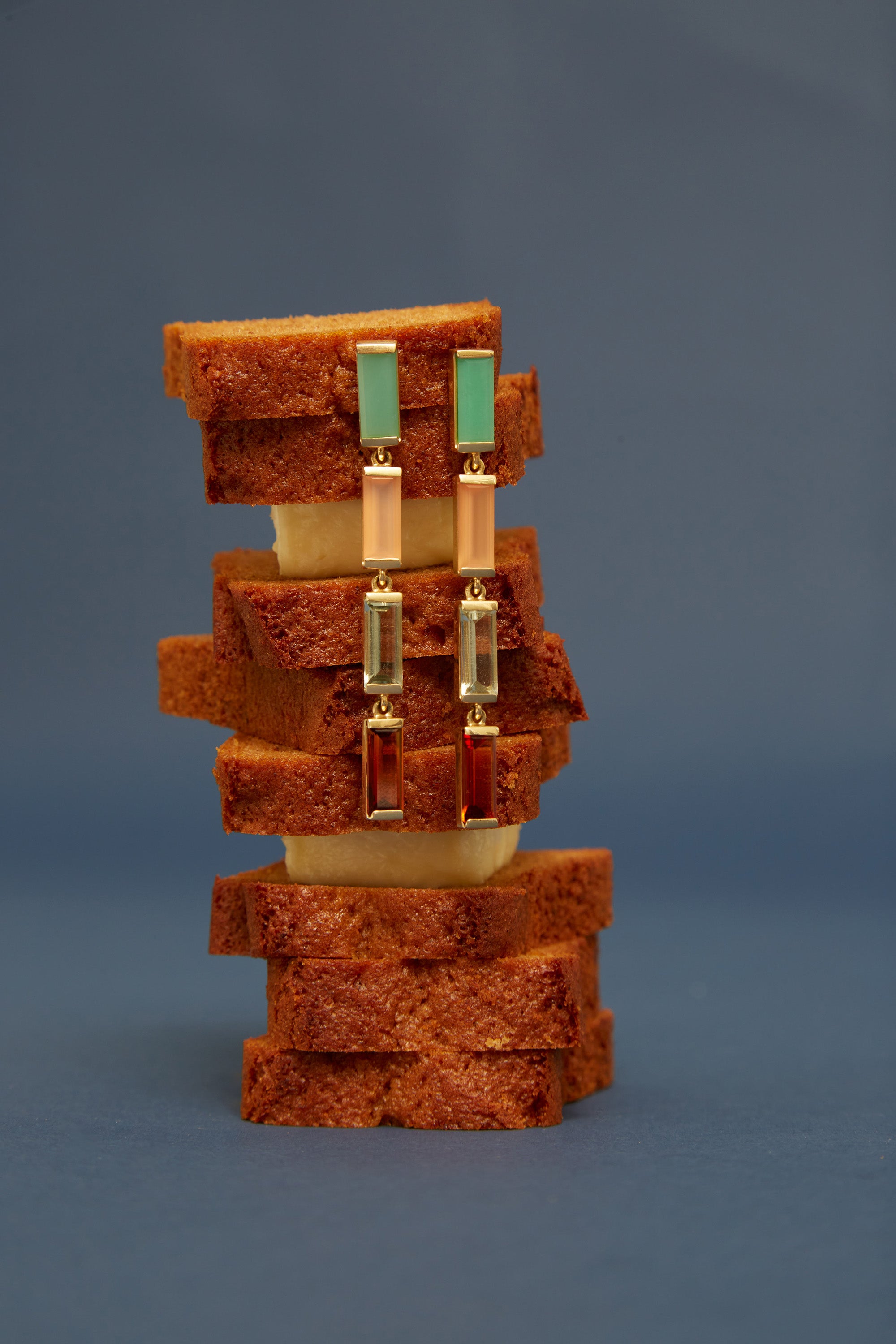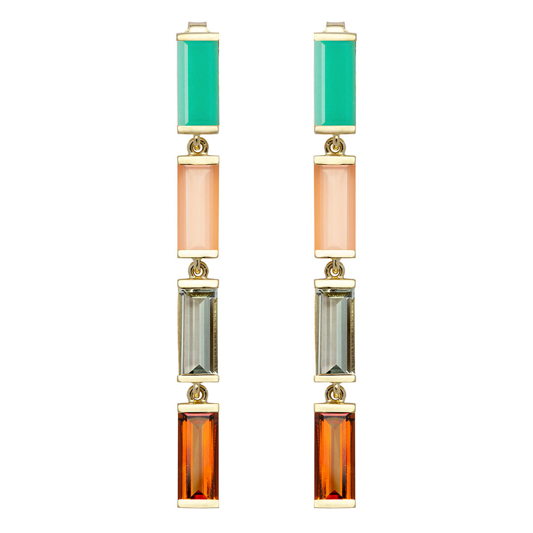 Material: 9kt yellow gold, 18kt yellow gold post backs, Chryoprase, Peach moonstone, Green amethyst, Madeira citrine in maxi baguette cut
