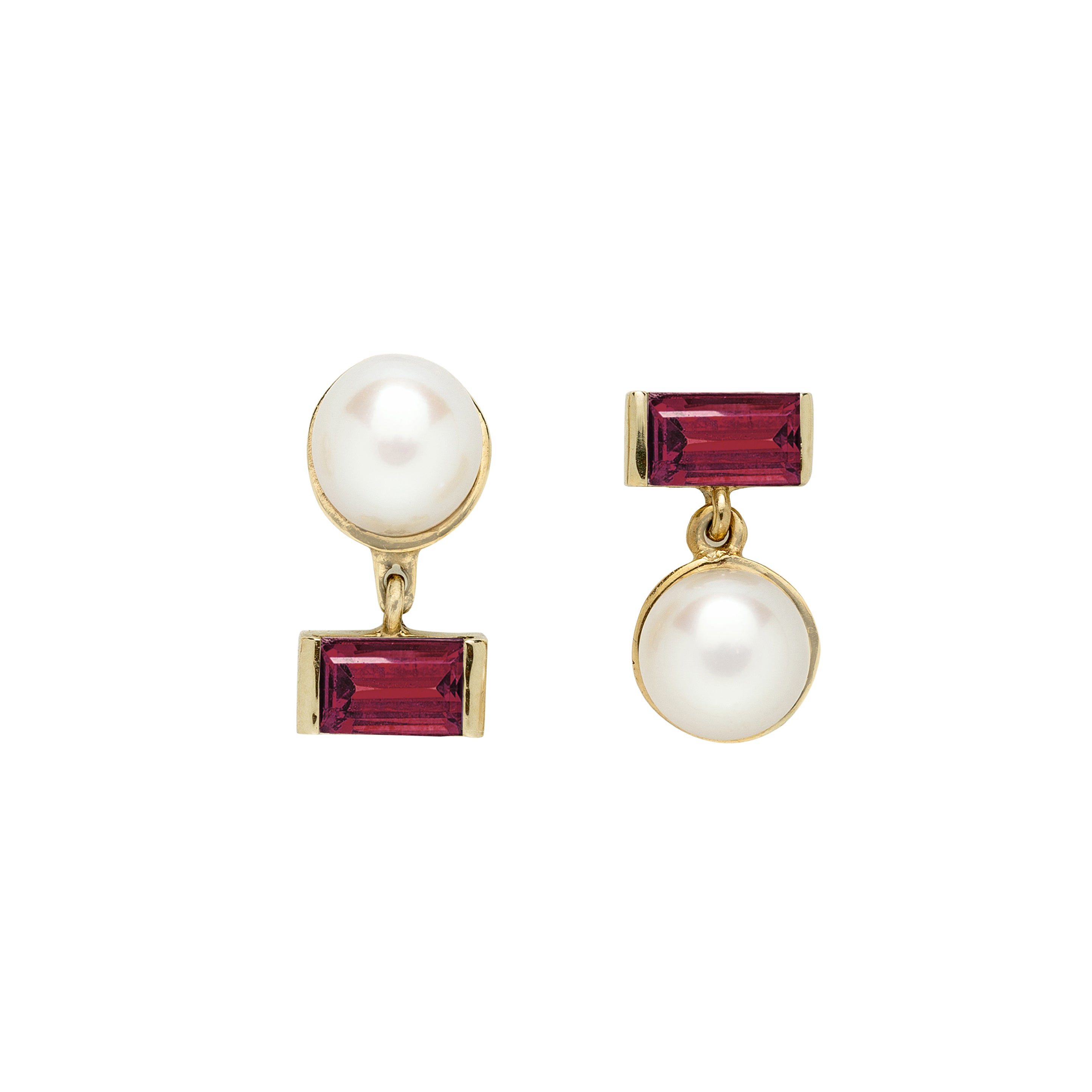 Material: 9kt yellow gold, 18kt yellow gold post backs, Freshwater pearls, Rhodonite stones in baguette cut