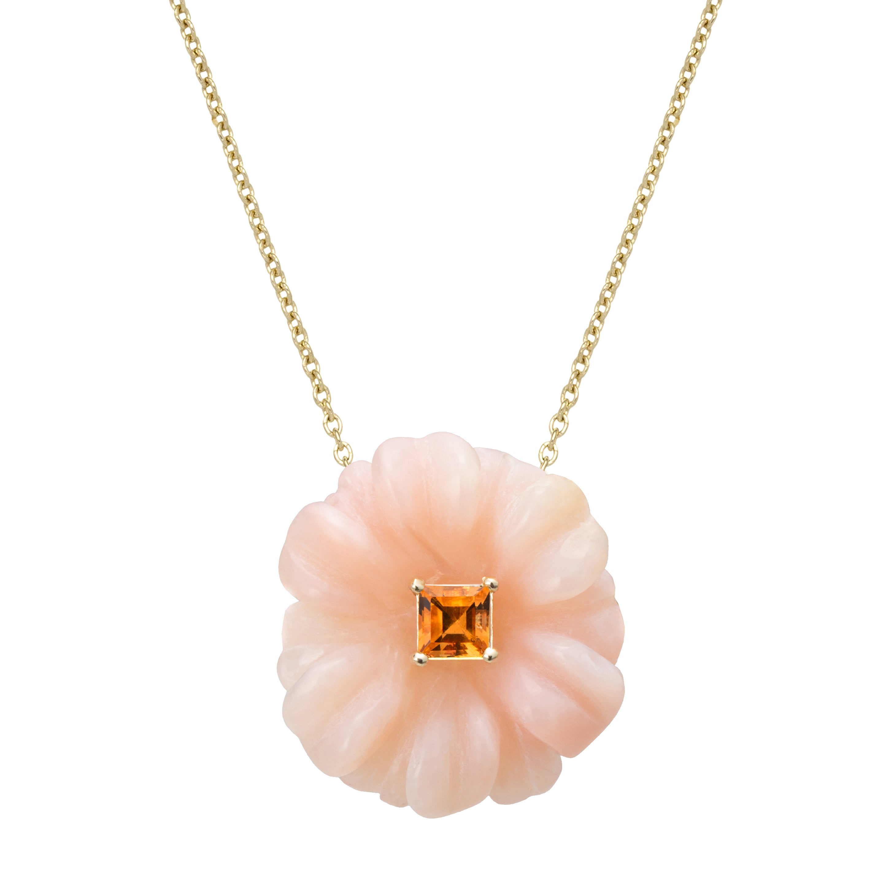 Glowing like a wildflower kissed by the last light of afternoon, this hand-sculpted pink opal flower pendant echoes the tender beauty of a garden in full bloom. A carré-cut citrine sits at its heart, breathing golden warmth into every facet and elevating this fine gemstone necklace into a piece that is at once striking and quietly lyrical.
