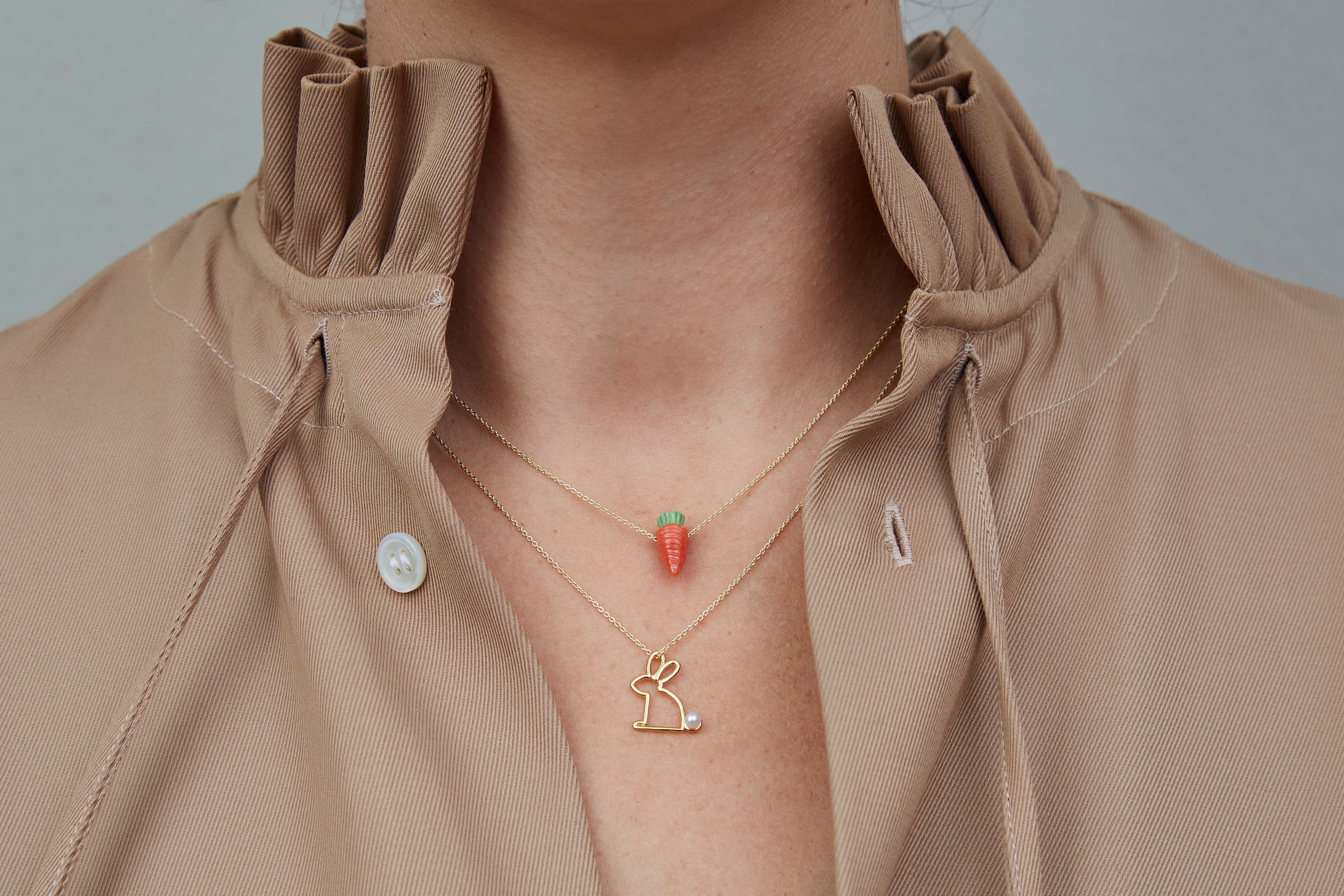 Our Conejito Perla (little rabbit with pearl) perfectly embodies what Aliita thinks of tenderness and softness. We suggest pairing this jewel with our coral Carrot--together they will bring you the right balance between freshness and energy.